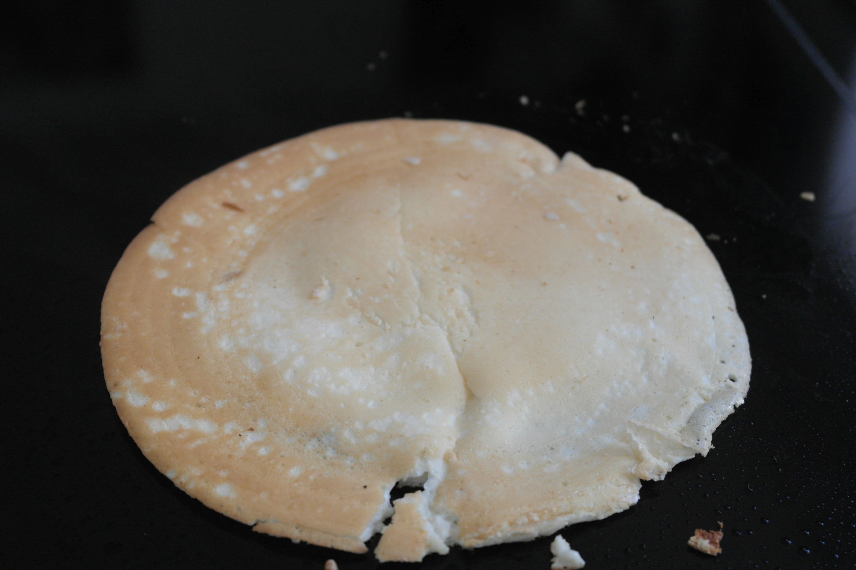 Nun wartet ihr, bis die Oberfläche fast komplett trocken ist, dann wenden.und nochmals 1 Minuten ausbacken.