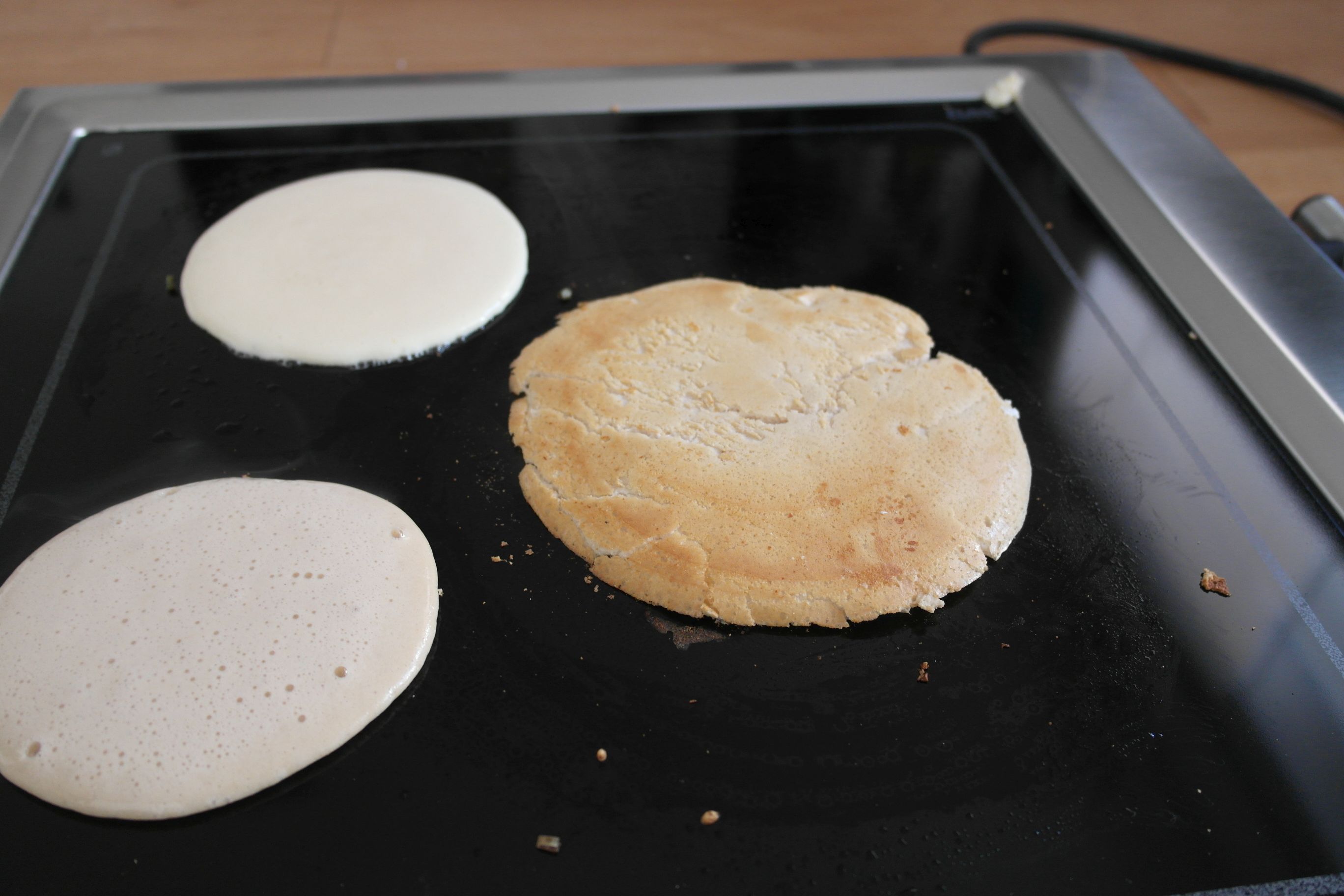 Öl dünn in einer Pfanne oder auf Crepemaker, oder auf einem tollen Glaskeramik-Grill (siehe hier) (sorry, ich bin einfach begeistert 🙂 ) verstreichen, und von jedem Pfannkuchen-Mix die Hälfte darauf geben, also einzeln, so dass ihr letztlich vier Pfannekuchen, zwei verschiedene Arten, bekommt. Gebt eine Kelle drauf, und streicht ihn kreisrund auf die gewünschte dicke aus, nicht zu dünn, sonst könnt ihr ihn nicht mehr wenden.