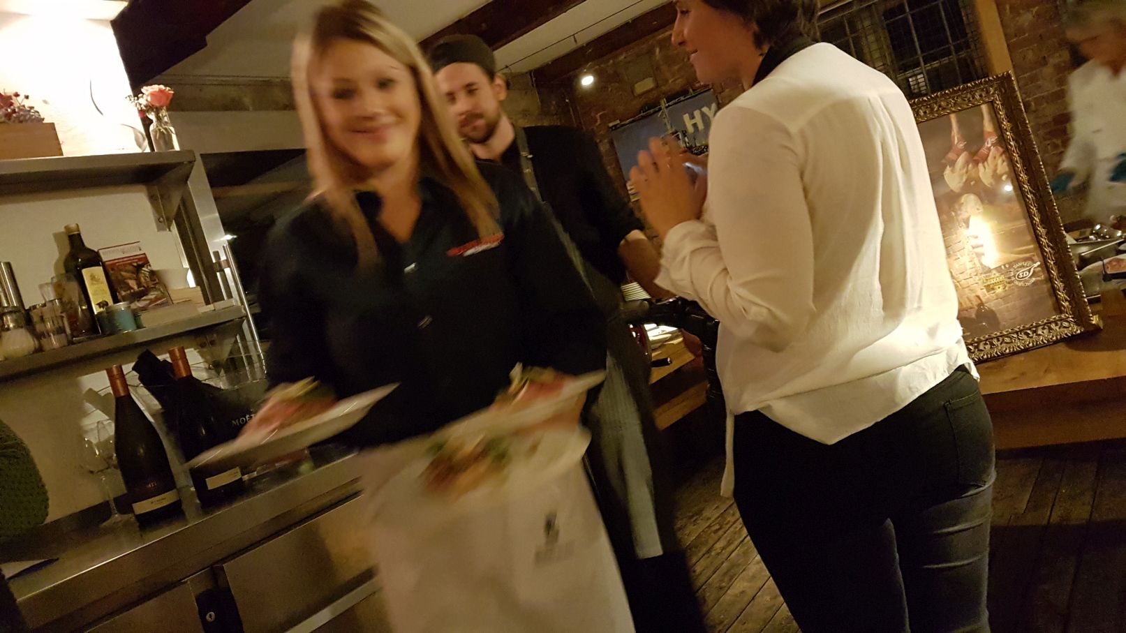Ein äußerst stimmig gedeckter Raum mit einer improvisierten Küche am Ende – der Ort wo ich die nächsten zwei Stunden verweilen würde. Die Überforderung kam direkt, als ich sah, dass ich fünf Gläser vor mir hatte? Wofür das? Eins reicht doch für Wasser, Cola, Wein – n Bier kann man auch reinkippen! 😀 Aber beeindruckend war es allemal.