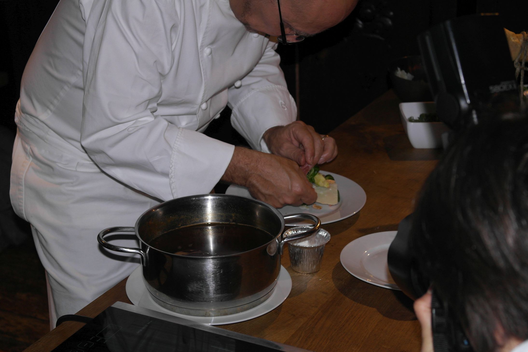 Heinz Beck, der immer redete als ob er Ahnung hat von dem was er sagt (das ist jetzt keine Ironie) brachte gleich mehrere Leute mit – einen Hilfskoch, einen persönlichen Assistenten (sowas wie Smithers für Mister Burns, aber  vom richtigen Ufer) und eine Dame die beim Kochen half. Ein Koch mit persönlichem (italienischen) Assistenten… als ob er ein Hollywood-Star wäre – äußerst amüsant wie ich finde und irgendwie sehr beeindruckend.