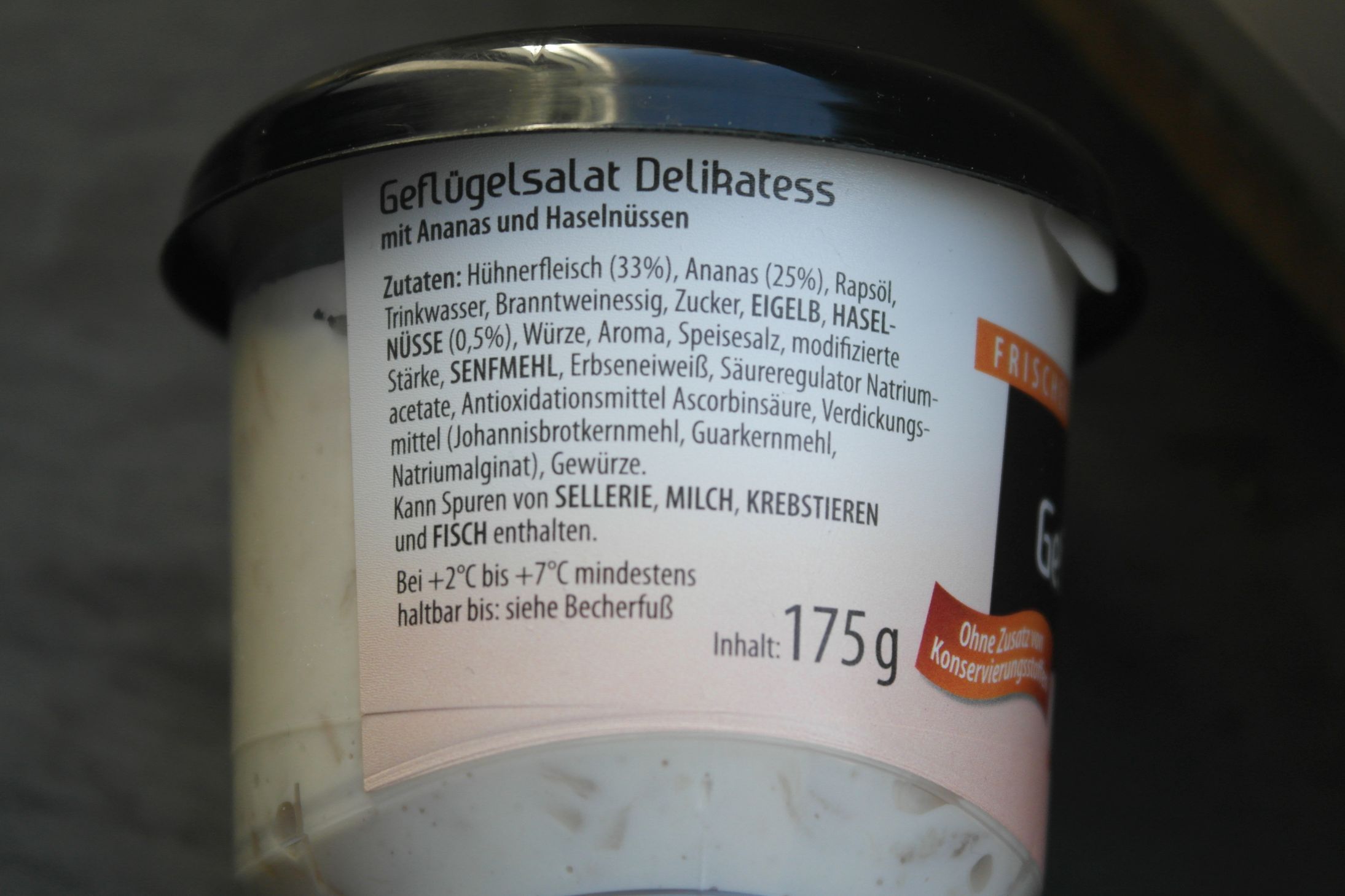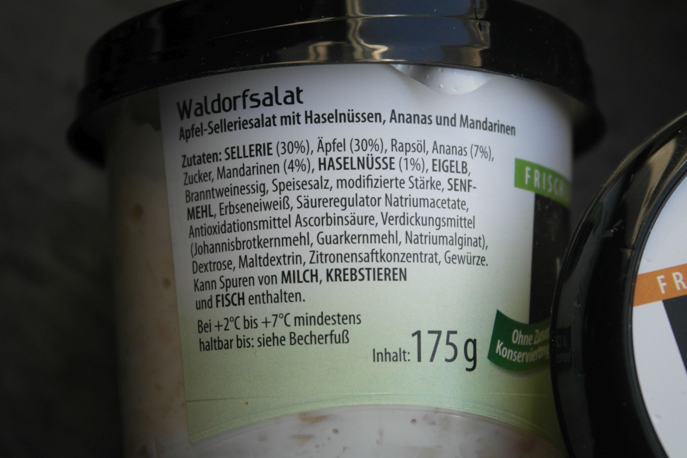 Lustig: Auf dem Geflügelsalat wird darauf hingewiesen: Kann Sellerie enthalten. Auf dem Waldorf-Salat steht das nicht 😀 Klar, da steht ja dick drauf 30 % Sellerie, daher muss es nicht extra erwähnt werden, aber trotzdem irgendwie amüsant (ich finde das lustig um 4 Uhr Morgens (da schreibe ich gerade den Artikel))