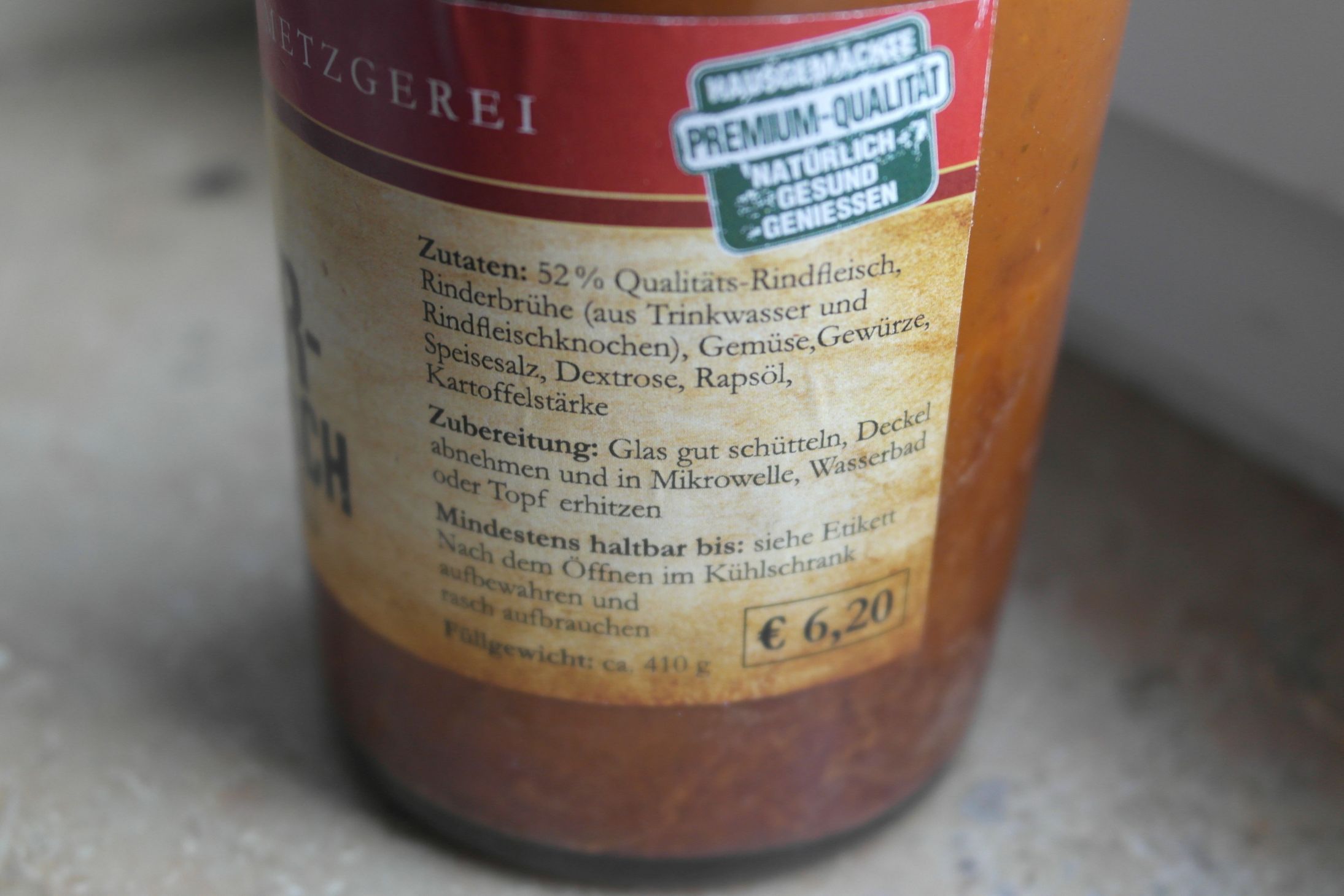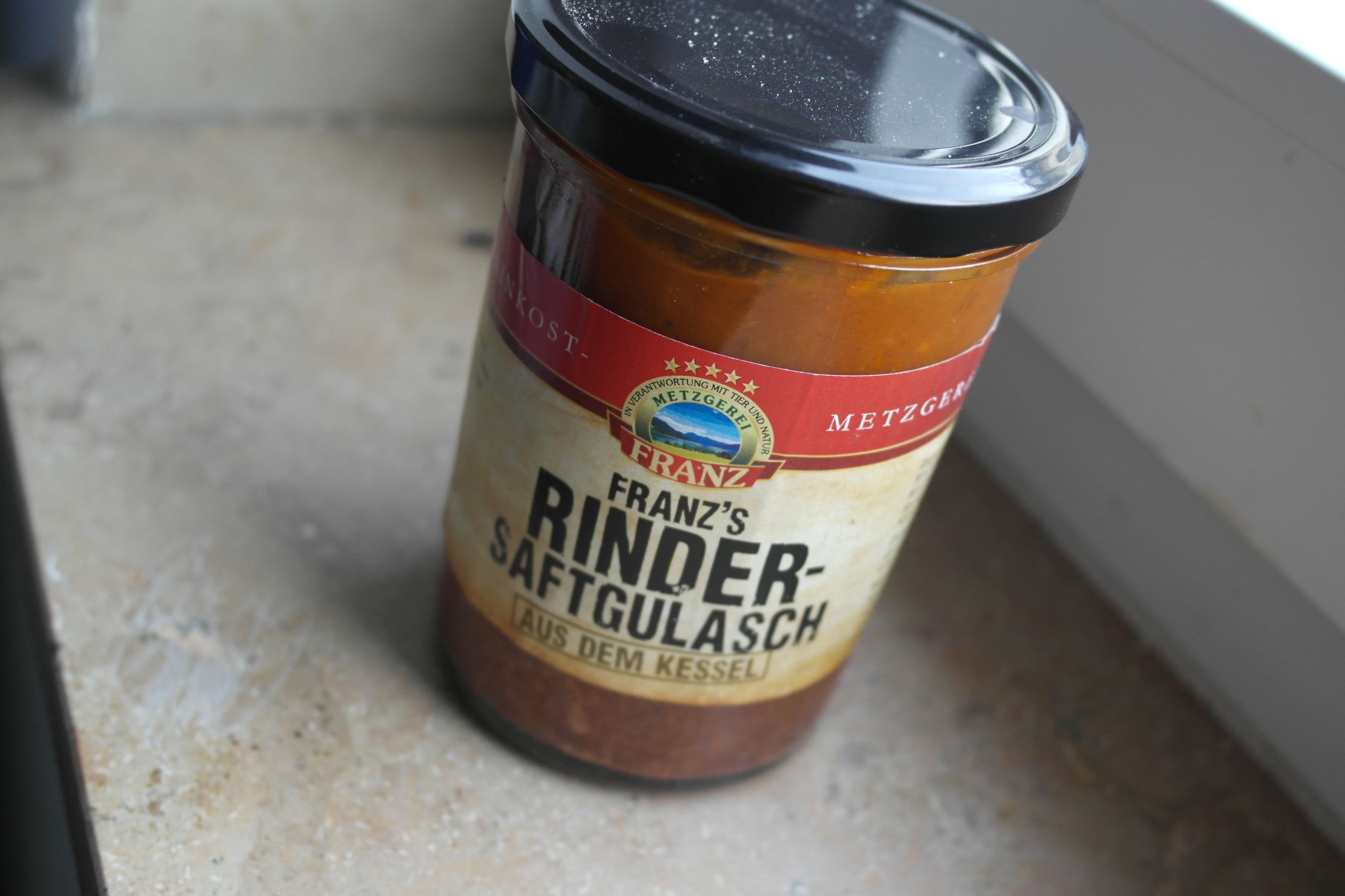 Zunächst ist es schon etwas kurios, wie da der Ochsenbraten und das Gulasch in diese Gläser gepackt ist. Es ist ungewohnt, und erscheint irgendwie unwirklich, aber wenn man dran riecht, vergisst man sofort, dass man „Fertigessen“ vor sich hat.