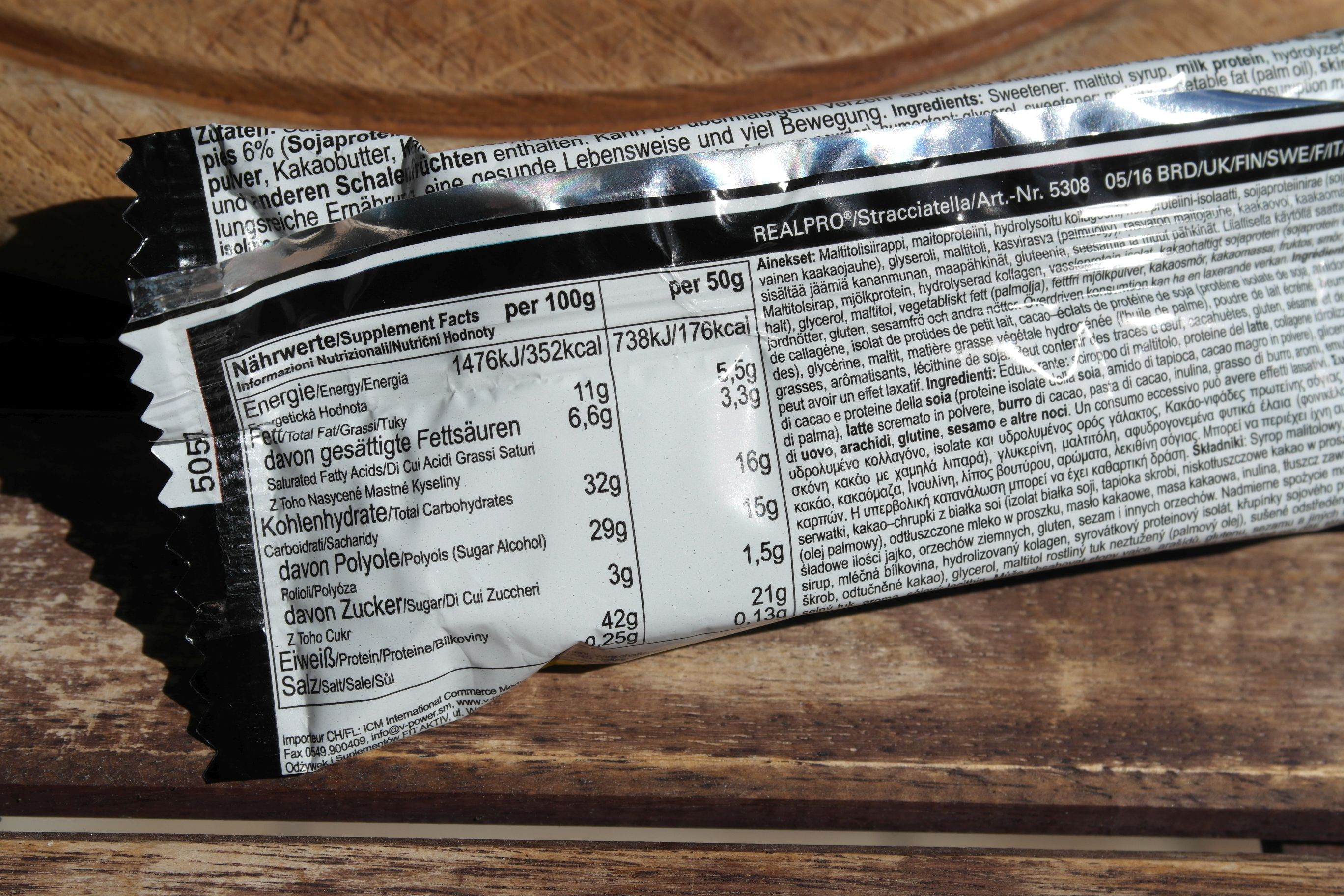 Der AllStars Protein Riegel 50g Riegel kostet 1,80 € (im Einzelkauf), je nachdem wo man ihn kauft. Das sind 3,60 € pro 100 g. Das ist schon recht teuer! Die Proteinriegel mit 50 % Protein von z.B. DM kosten knapp 2 € pro 100 g und sind trotzdem gut dafür! Dieser Riegel hier hat 42 % Protein und soll Low Carb sein. Ich teste die Sorte „Stracciatella“.