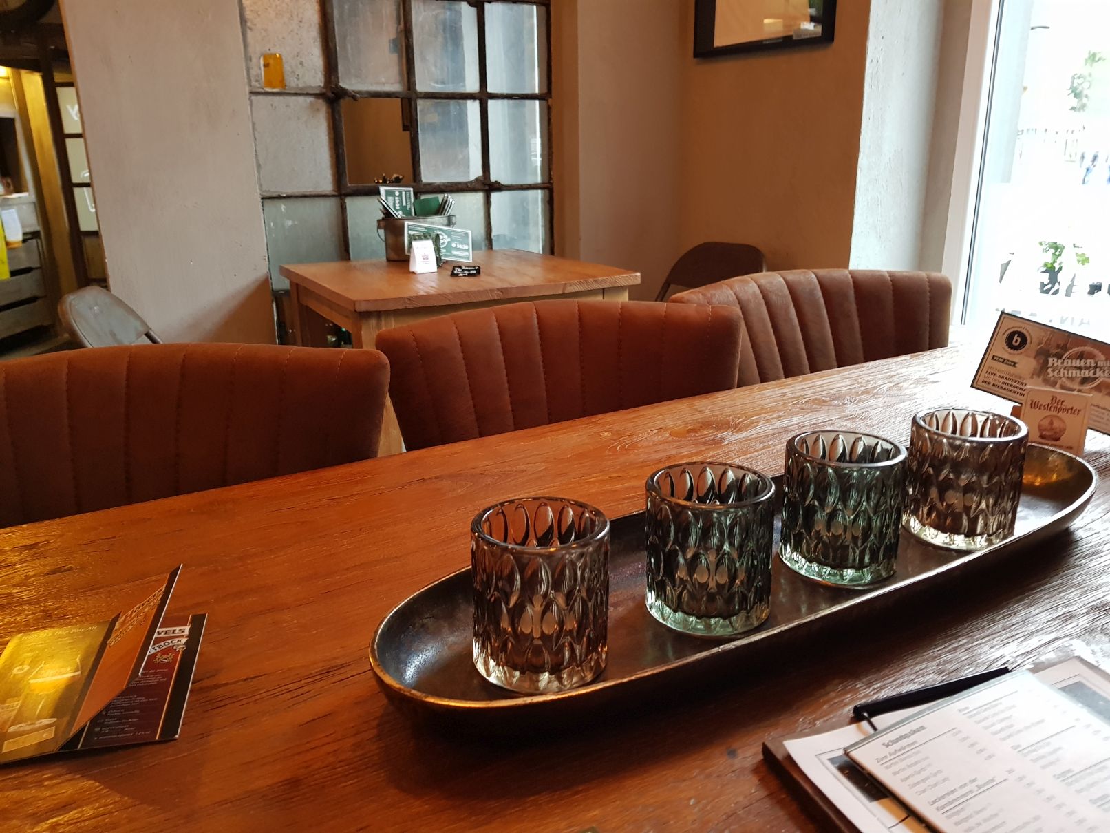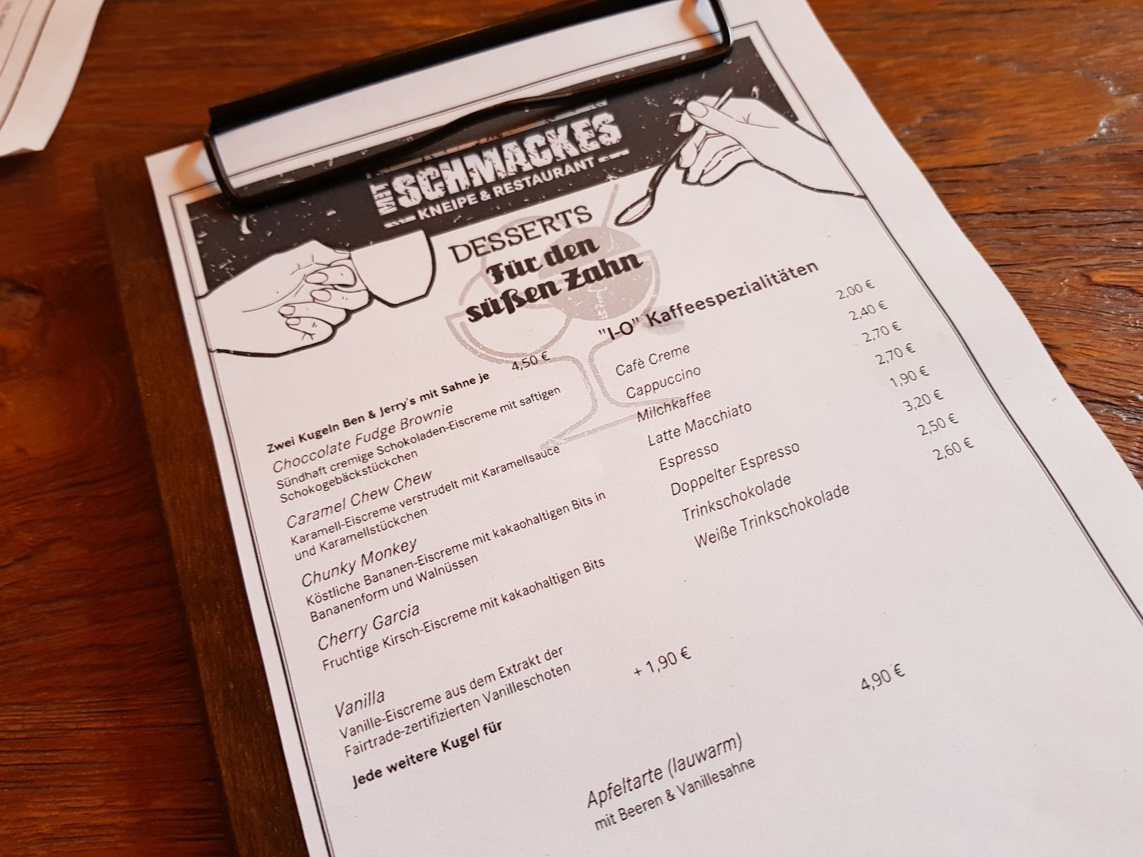 Man sollte übrigens reservieren im „Mit Schmackes“. Auf jedem Tisch waren an diesem Freitag, an dem wir um ca. 15 Uhr da waren, „reserviert“-Schilder. Abends muss es dort brechend voll sein. Es gibt kleinere Tischgruppen für zwei Leute, welche für vier bis sechs Leute, aber auch welche für größere Gruppen. Ich denke an Abenden an denen Spiele übertragen werden, wird man mit einem Schneepflug in den Laden gequetscht werden müssen.