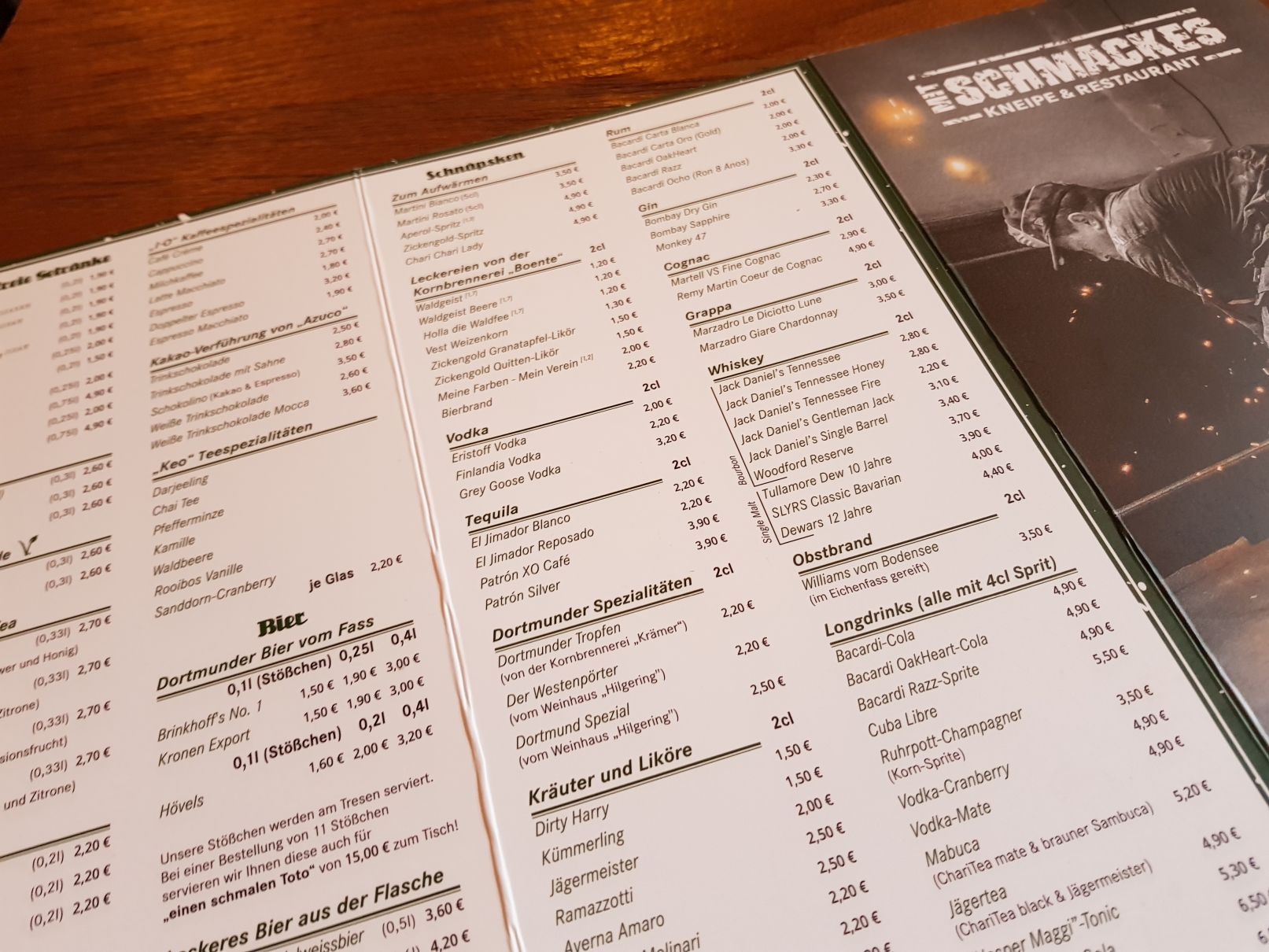 Die Einrichtung des Schmackes gefällt: dunkle Möbel, etwas urig eingerichtet. Dazu gibt es hier und dort aufgehangene Trikots (die dann noch mehr Sinn ergeben) und natürlich fernscher – denn es wird auch Fußball übertragen.