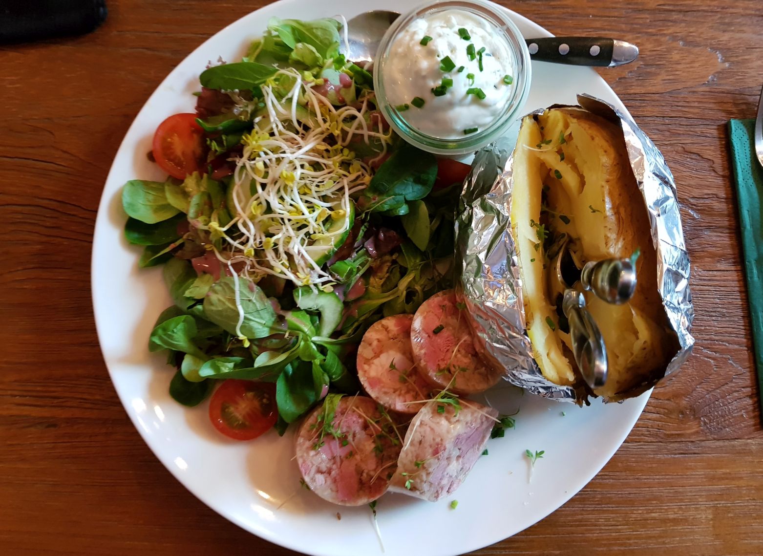 Der Hauptteil bei mir war die Sülze und Backkartoffel, wobei ich auch gegen einen Aufpreis von 1 € die Bratkartoffeln austauschen konnte, gegen eben die Backkartoffel. Erst dachte ich: Warum nen Euro Aufpreis? Ob ich nun Bratkartoffeln oder ne Backkartoffel nehme…. Als ich dann die monströse Backkartoffel mit eigenem Gravitationsfeld sah, wusste ich warum. Allein mit der müsste manch ein Gast kämpfen. Die kann man übrigens auch überbacken mit Salat bestellen – muss ich mal auch in der Variante probieren.