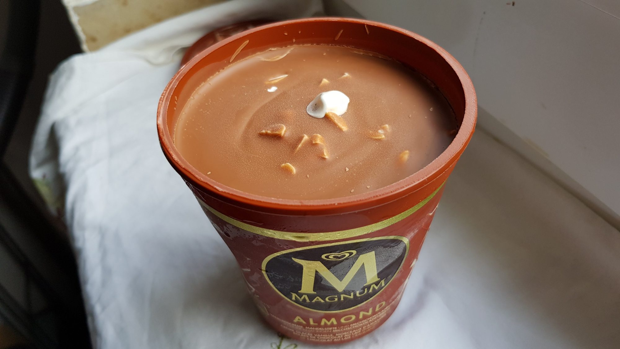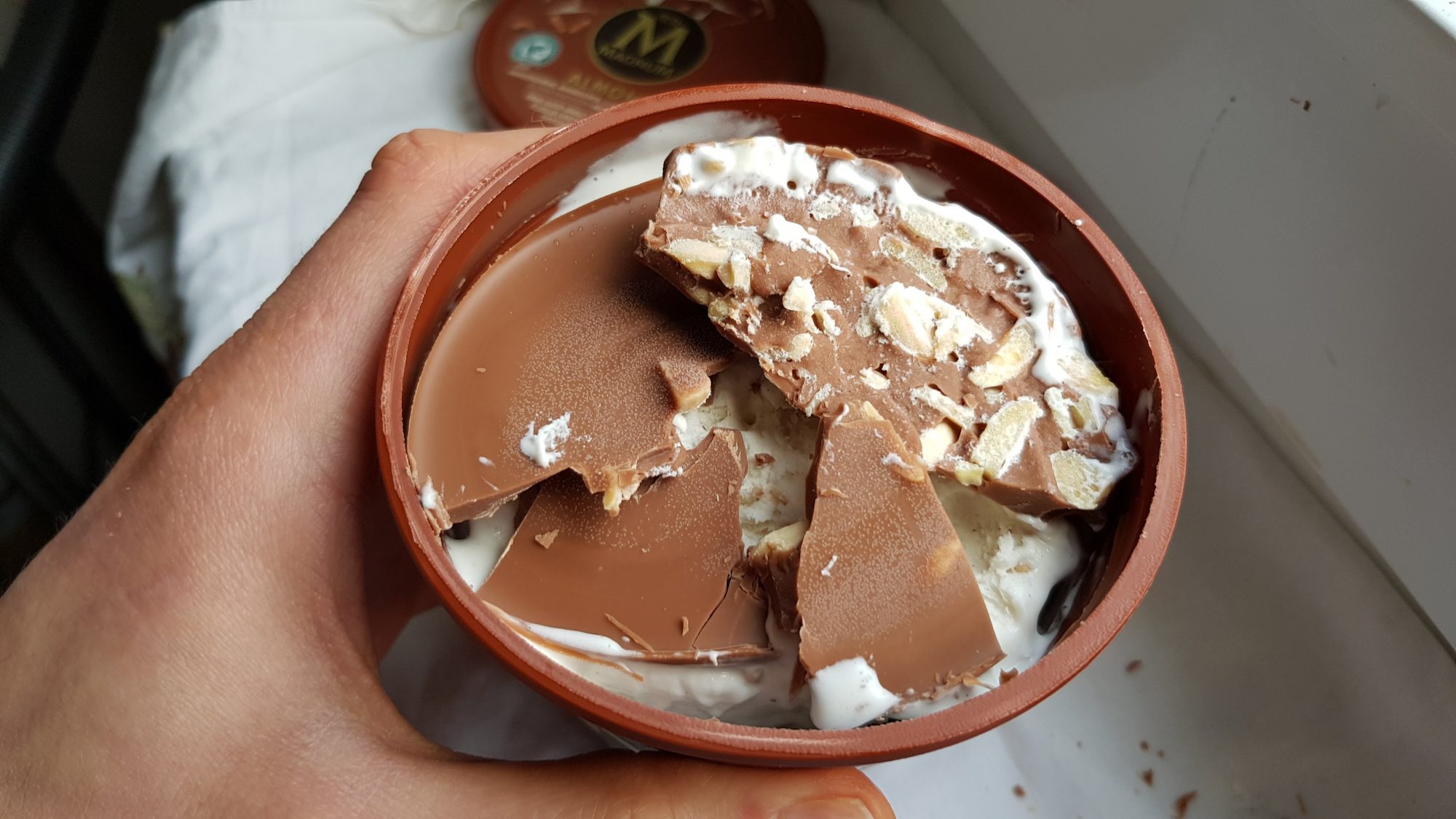 Eines der Highlights der Magnum Eis ist natürlich die reichhaltige Schokolade. Oben auf den Pints befindet sich eine dicke fette Schicht Schokolade, die es zu knacken gilt indem man den Becher zusammendrückt. Dass das nicht wirklich so funktioniert wie es soll, könnt ihr in meinen Testvideos sehen 😀