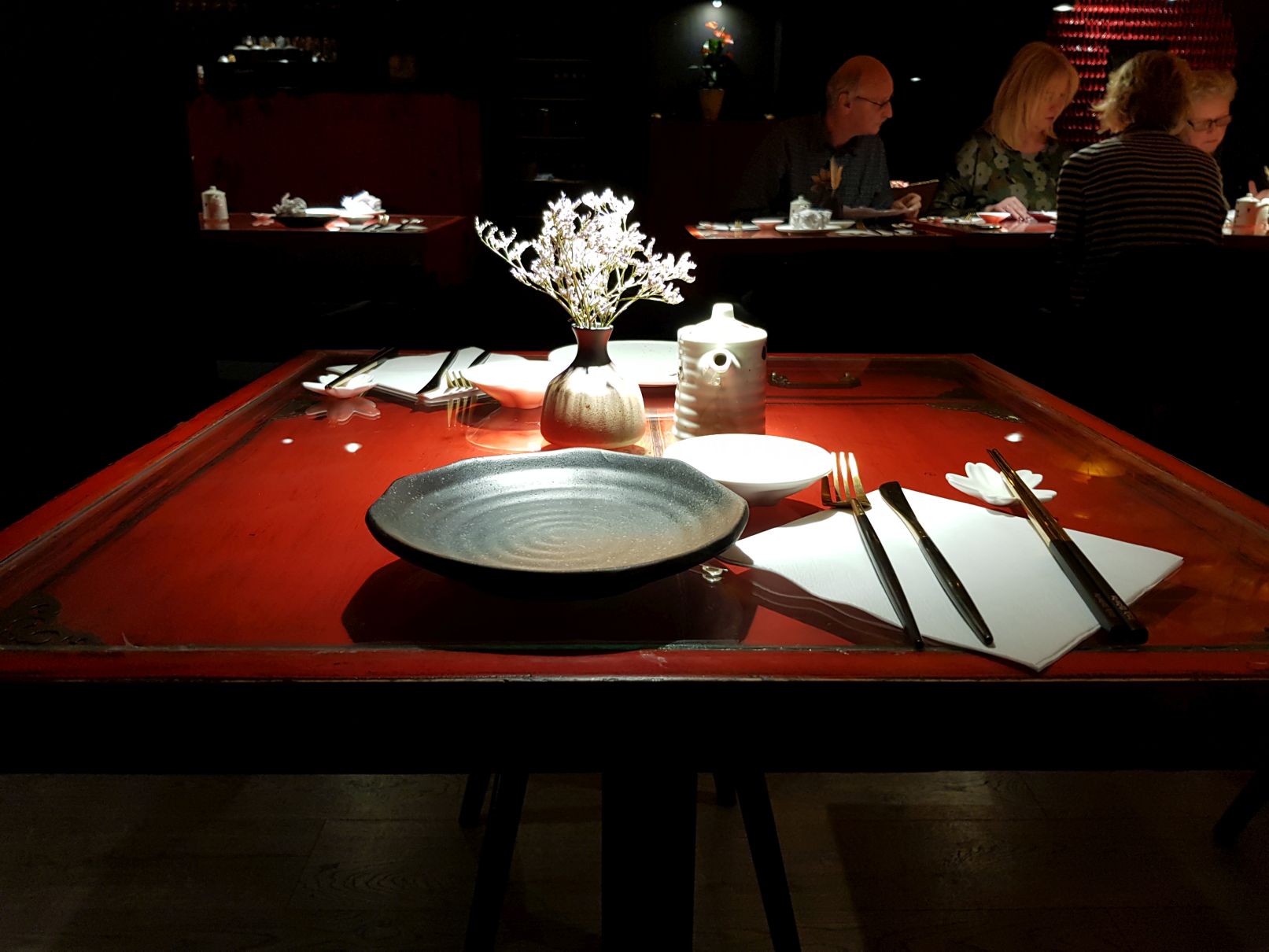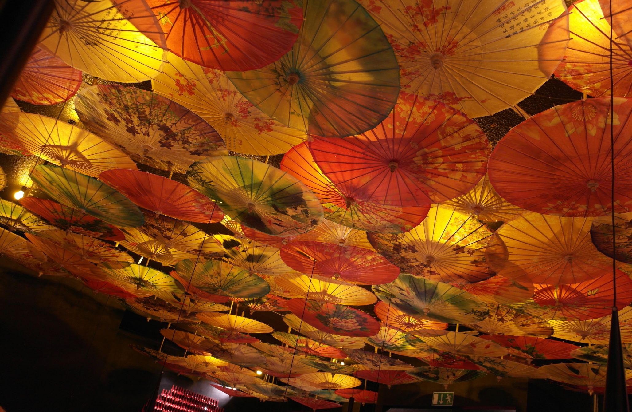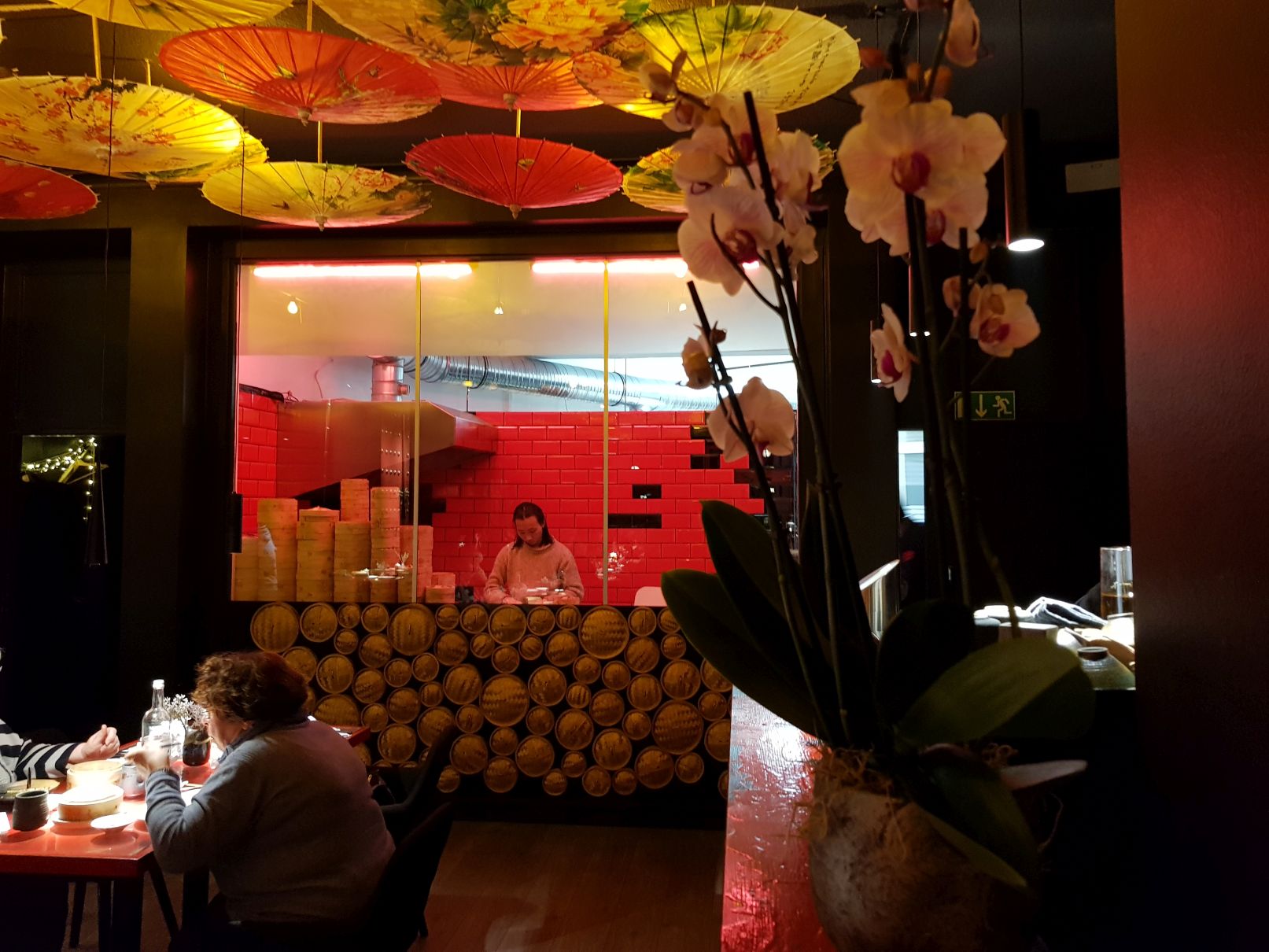 Direkt beim Eintreten fällt die imposante Deckenbeleuchtung mit den chinesischen Papierschirmen ins Auge, welche dem Restaurant ein wunderbares, warmes Licht verleihen. Apropos Licht… Diese leuchtenden Glasfasern an der Decke bzw. Gang runter zum WC sind toll. Sehr schick! Selten habe ich ein so stimmiges Restaurant betreten.