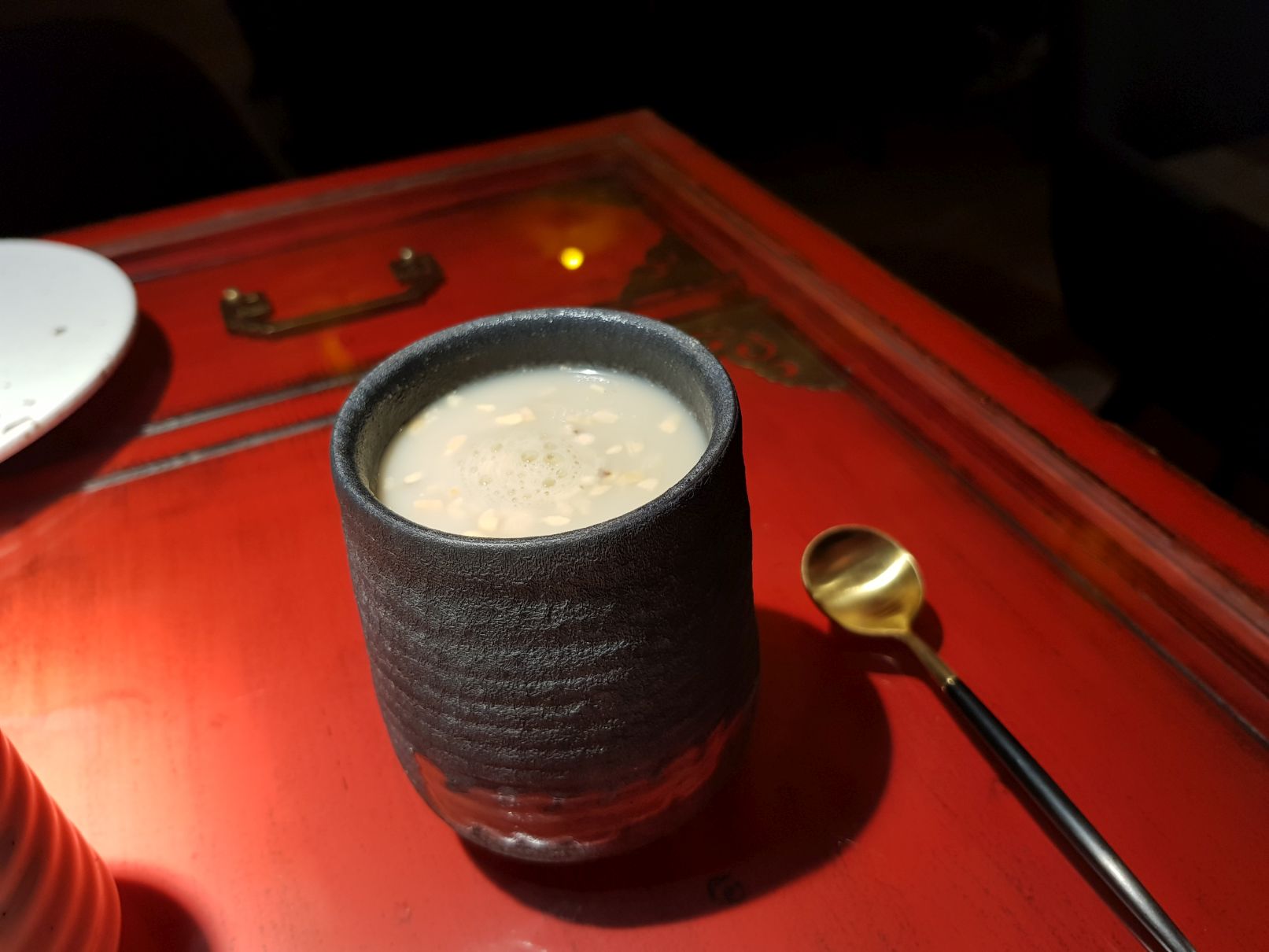 Als Getränk gab es etwas was sich „Tee“ nannte aber eher eine Art Soja-Milch war mit gerösteteten Walnüssen, Pinienkernen usw. Die Bestellung wurde schnell bearbeitet vom netten Personal (welches nicht 100 % dem Deutschen mächtig war – finde ich gut, wirkt authentischer ) schnell gebracht. Man muss aber ja auch sagen dass der Aufwand bei den Speisen nncijt sehr hoch ist. Nach ca. 15 Minuten hatte ich alles.