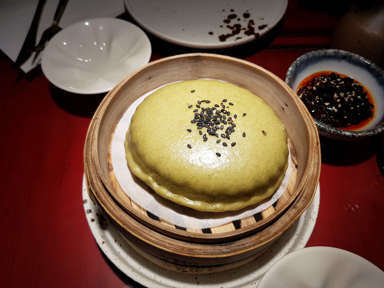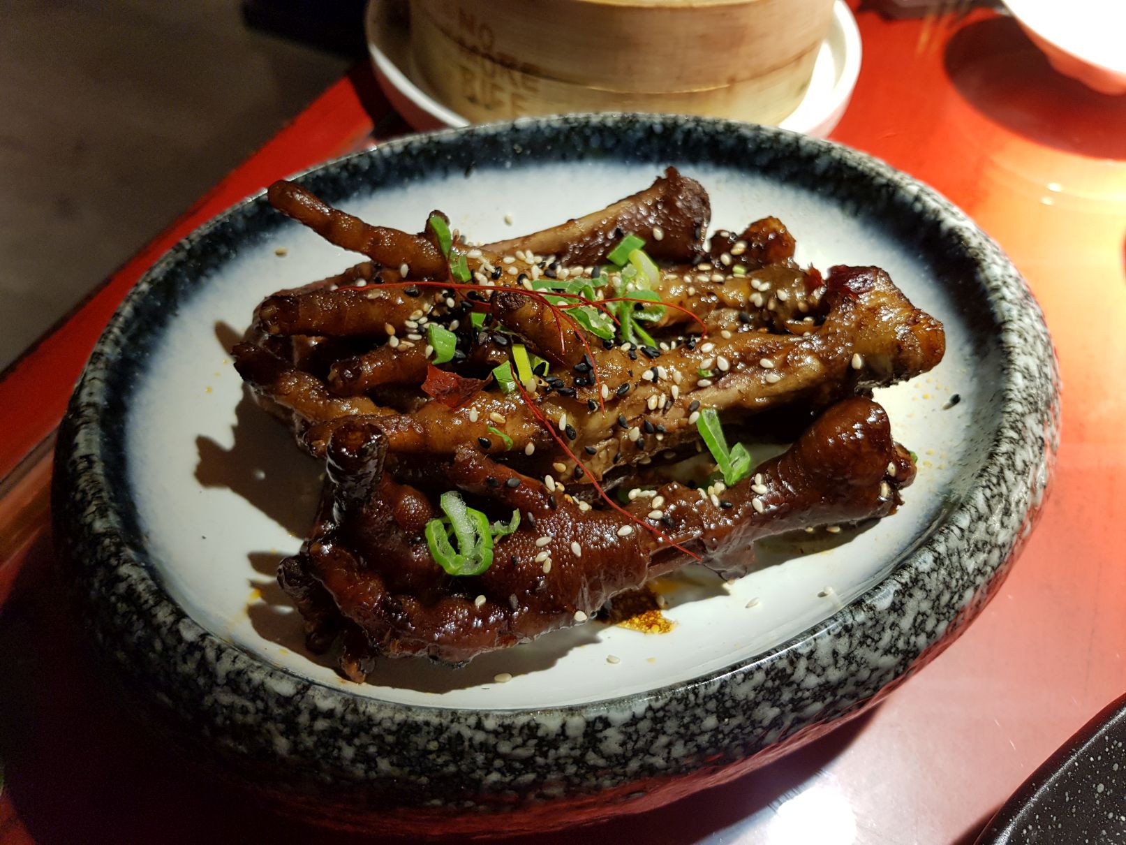 Also ich kann direkt festhalten: Alles sah sehr schön aus (selbst die Hühnerfüße sahen nicht so grausam aus wie man es erwartet, man darf nur nicht zu lange hingucken). Brötchen und Teigtaschen kamen im Bambus-Dampf-Korb-Dings-Bums-Mopped, die Hühnerfüße in einer dekadenten Schale. Sehr beeindruckend: Der Tee im Steingefäß. Man möge mir Luft zuwedeln während ich speise!