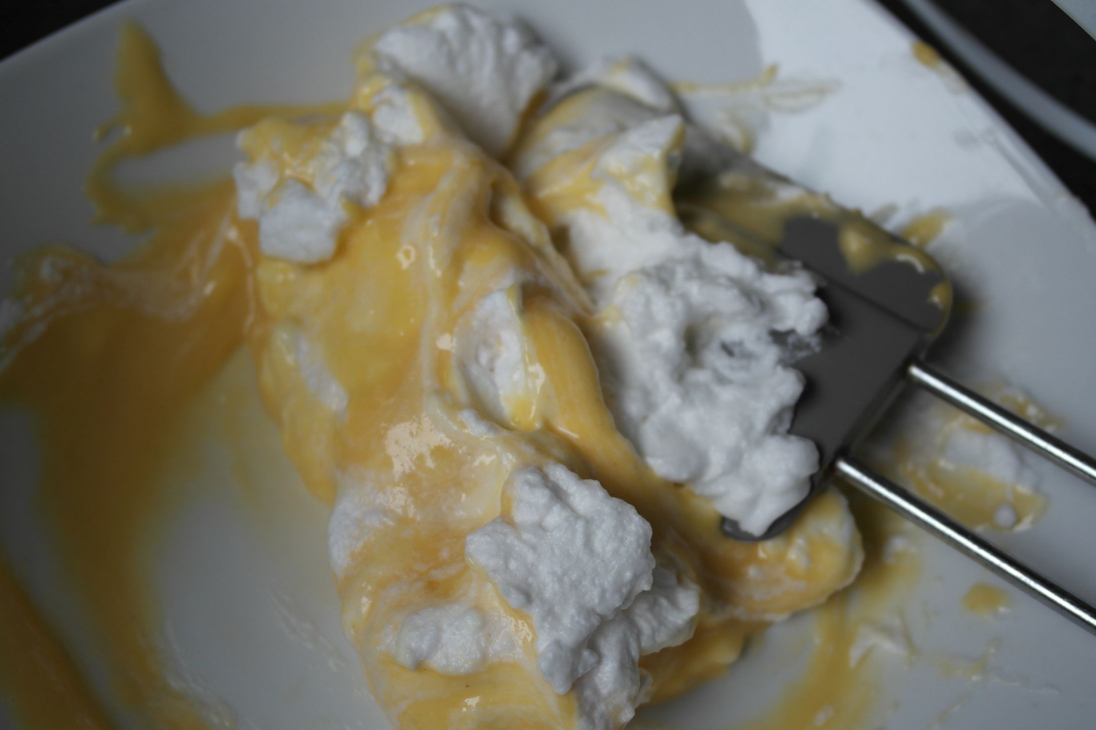 Den Eischnee in drei Schritten unter die Eigelb-Masse heben. Ganz vorsichtig, ihr dürft nicht zu viel Luft dabei rausrücken. Am Ende sollte alles gut vermischt sein, aber locker flockig! Lieber 1-2 noch weiße Stellen haben, als dass man zu viel Luft rausdrückt. Das ist die Quintessenz für gute japanische Pancakes.