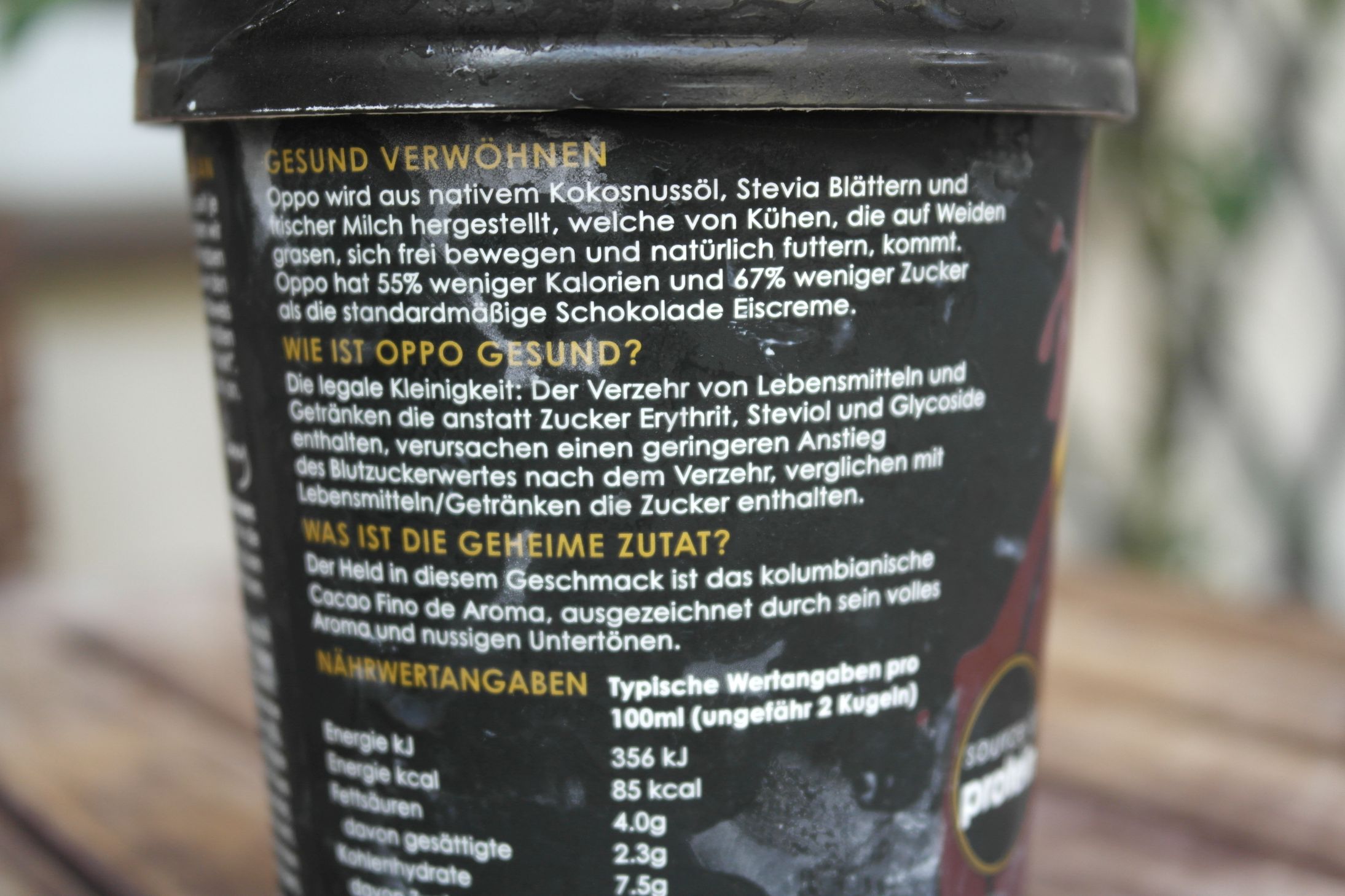 Die Kalorien sind wirklich niedrig bezogen auf 100 ml. Wenn man das Eis allerdings auf die Waage stellt und die Kalorien auf 100 g betrachtet, ist es auch nicht sehr viel mehr als bei einem Cremissimo leicht. Ca 170 Kilokalorien pro 100 g. Der Zuckergehalt ist niedrig, und für ein Eis hat das echt viel Protein. Das Oppo Eis ist also wirklich irgendwo fitter und kalorienärmer als „normales“ Eis.