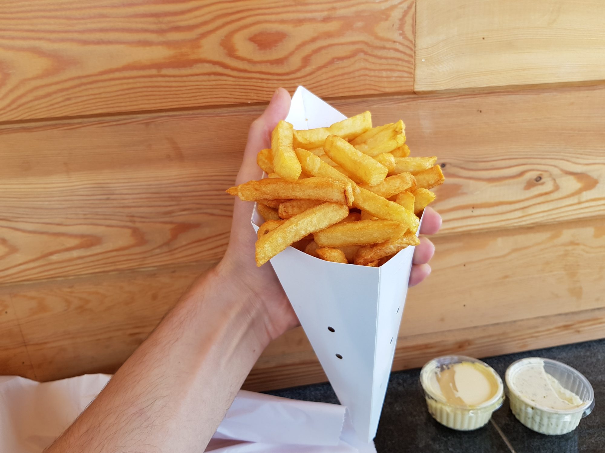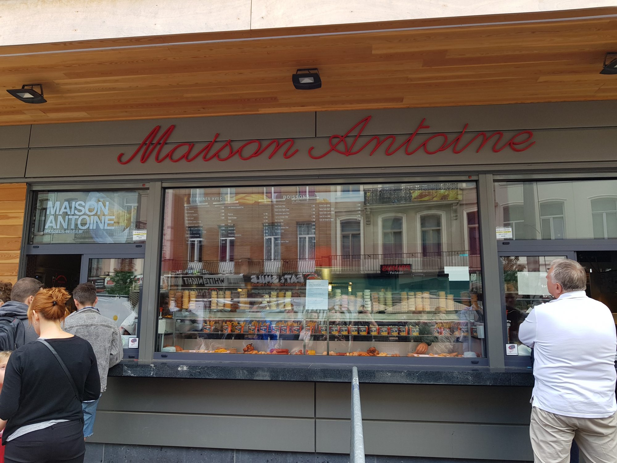 Mittags ging es zum Maison Antoine, der berühmtesten Frittenbude in Brüssel. Selbst Angela Merkel war dort. Was soll ich euch sagen? Es war echt nicht gut! Zwar waren die Pommes perfekt frittiert, außen knusprig und innen locker, super gut gemacht, muss ich sagen, allerdings schmeckten sie kaum. Der Geschmack nach Kartoffel war lächerlich, viel zu lasch, und sie waren einfach auch nicht gut gewürzt. Wir mussten uns Salz nachher drauf geben lassen. Die Preise waren in Ordnung für die riesigen Portionen, wobei so ein Baguette mit Pommes schon dekadent ist. Das kann man sich zu zweit teilen. Man sollte auch damit rechnen, dass man sich anstellen und warten muss. Wenn man um den Laden rumgeht, gibt es ein kleines Seitenfenster, was man erstmal nicht sieht. Ein echter Geheimtipp um nicht lange anzustehen. Wir haben es leider übersehen Anfangs.