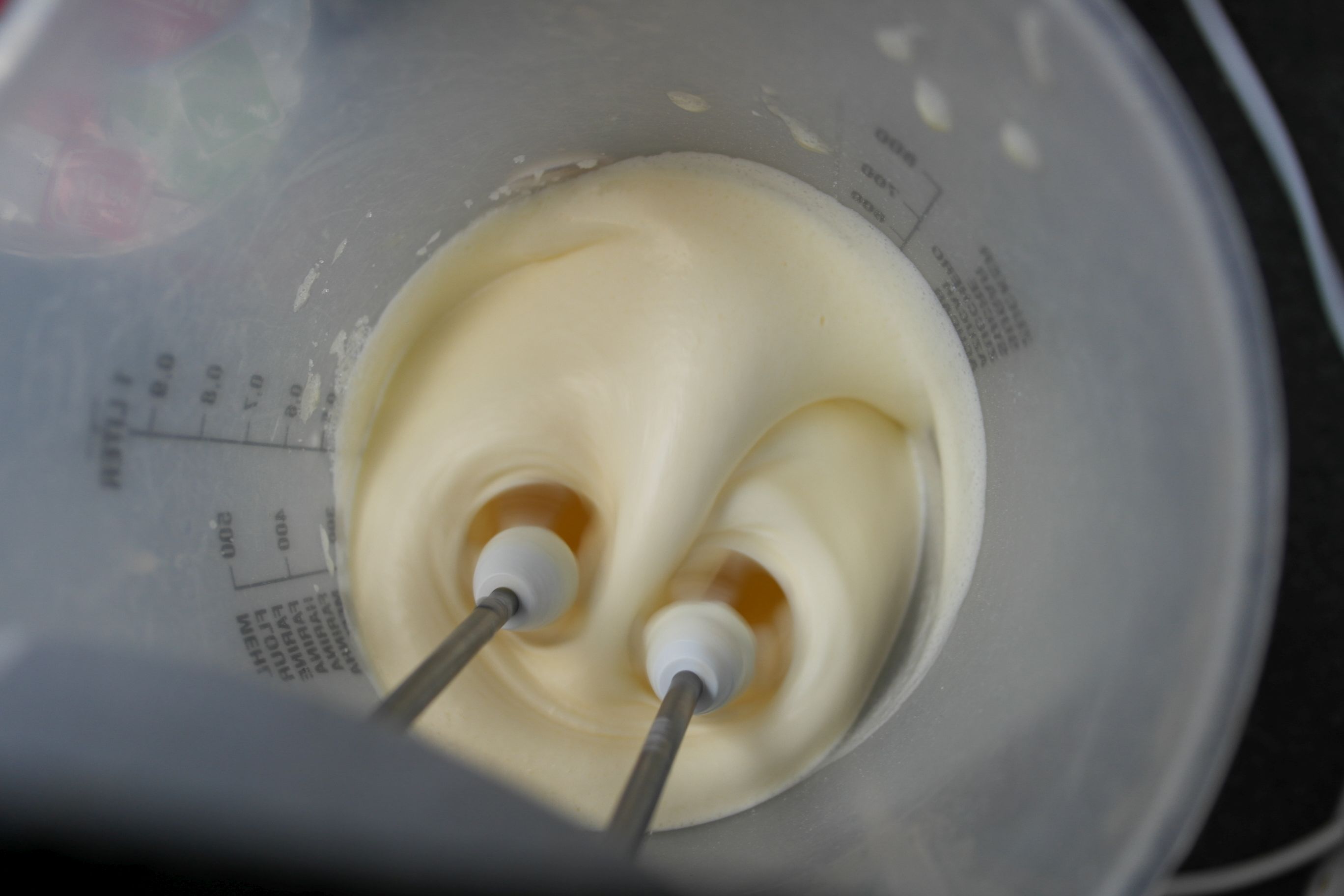 Für das Eis die Eier eine Minute mit dem Handmessgerät fluffig rühren. Dann nach und nach den Zucker zugeben und vermengen.
