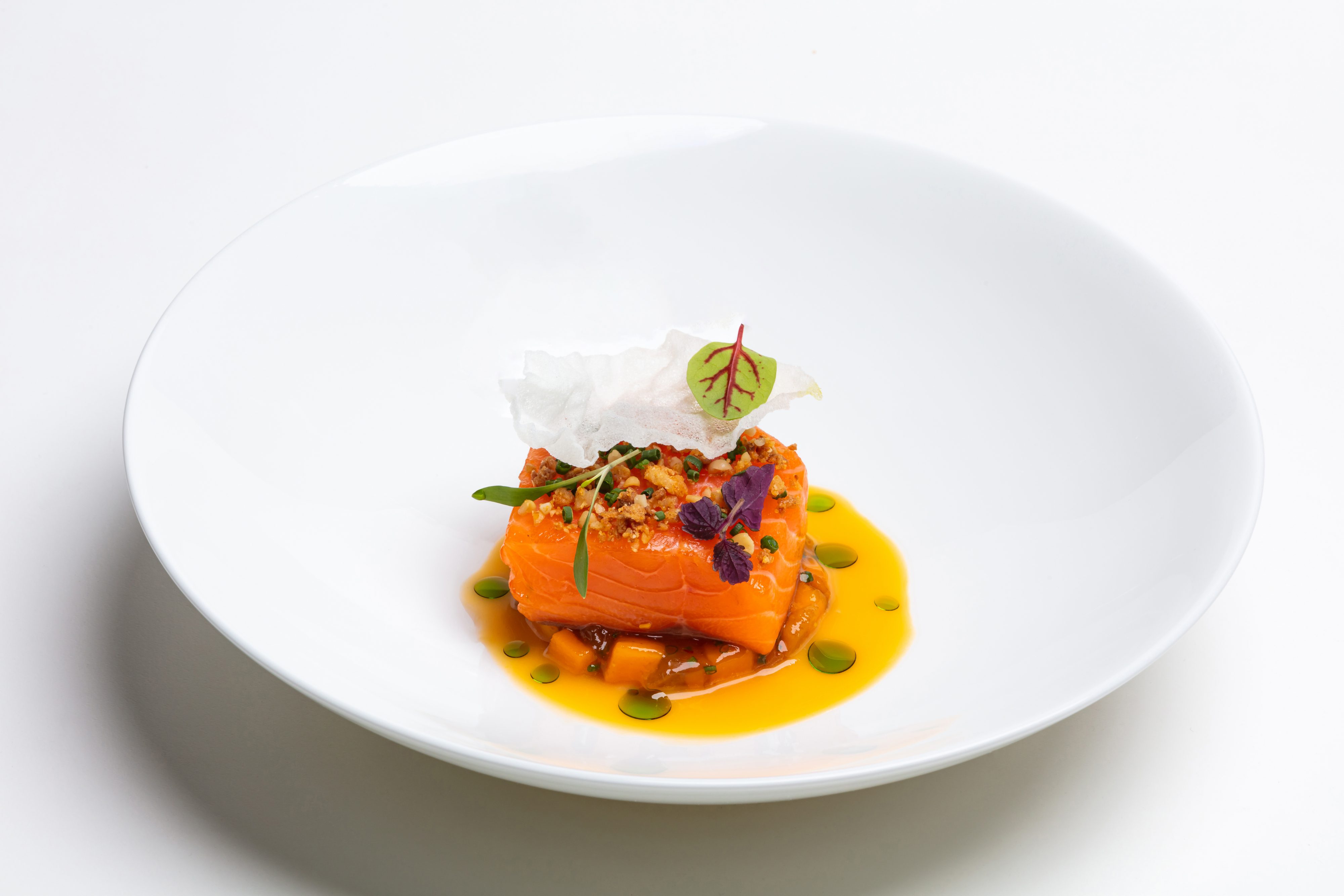 Die Vorspeise war direkt was für mich! Es gab wunderbar aromatischen Lachs und als perfekten Kontrast dazu eine Art Currysauce. Ich glaube es war Mango, was den fruchtigen Kontrast dazu gab. Das Zitronengras setzte wie „i-Tüpfelchen“, wenn man ein Stück davon im Mund hatte. Der Gewürzkürbis hatte Biss und war der Kontrast in der Konsistenz zum zarten Lachs. Sehr gut!