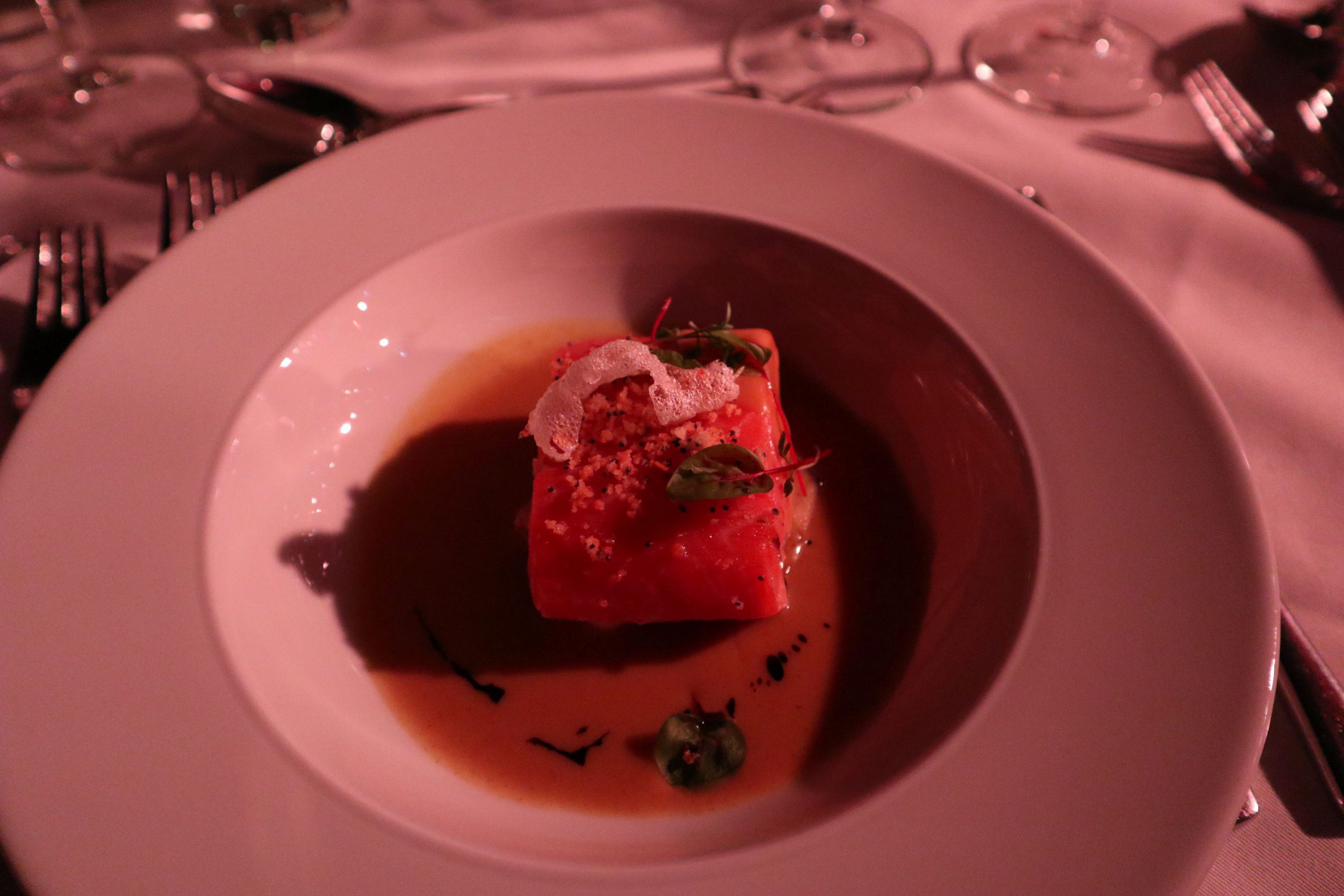Nach einer Einführung durch den Moderator und nach den ersten Acts kam auch die Vorspeise. Ein butterzarter Lachs in einer feinen Sauce. Optisch sah es gut aus und er schmeckte mir auch. Meine Freundin hatte den veganen Maultaschen, welche ebenfalls sehr lecker waren. Die Teller waren vorgewärmt, was ebenfalls einen professionellen Eindruck machte. Leider wurden wir so ziemlich als letztes bedient, was dazu führte dass die Vorspeise nicht richtig heiß war (zumindest die meiner Freundin, meine sollte es ja nicht sein). Ich denke aber das werden die auch in den Griff bekommen mit zunehmender Zahl der Abende.