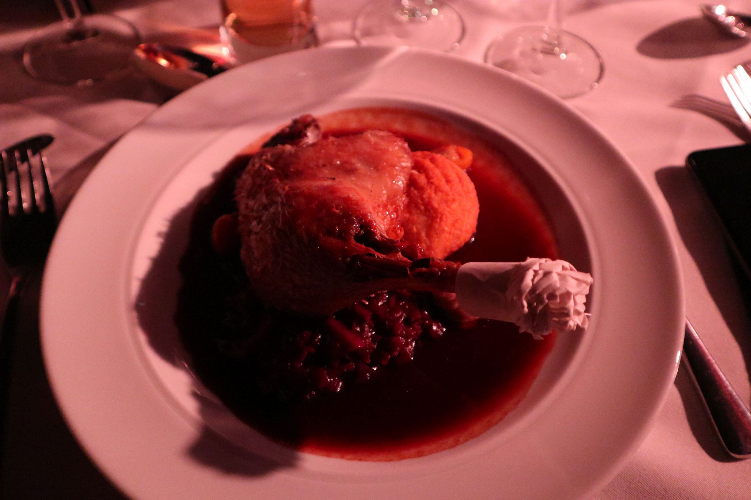Der Hauptgang, die Entenkeule mit Rotkohl und Marillenknödel war ebenfalls sehr gut. Man mag mich jetzt belächeln, aber der Rotkohl war für mich das kulinarische Highlight des ganzen Abends. Nie hatte ich einen besseren! Aber auch der Knödel oder die Polenta meiner Freundin warn toll. Das Schoko-Dessert zum Abschluss passte perfekt. Am Ende war man satt ohne vollgestopft zu sein. Ich denke aber ein guetr Esser brauchte vorher die Snacks, die vor dem Anfang der Show gereicht wurden. Oder die Brötchen mit Butter auf den Tischen.
