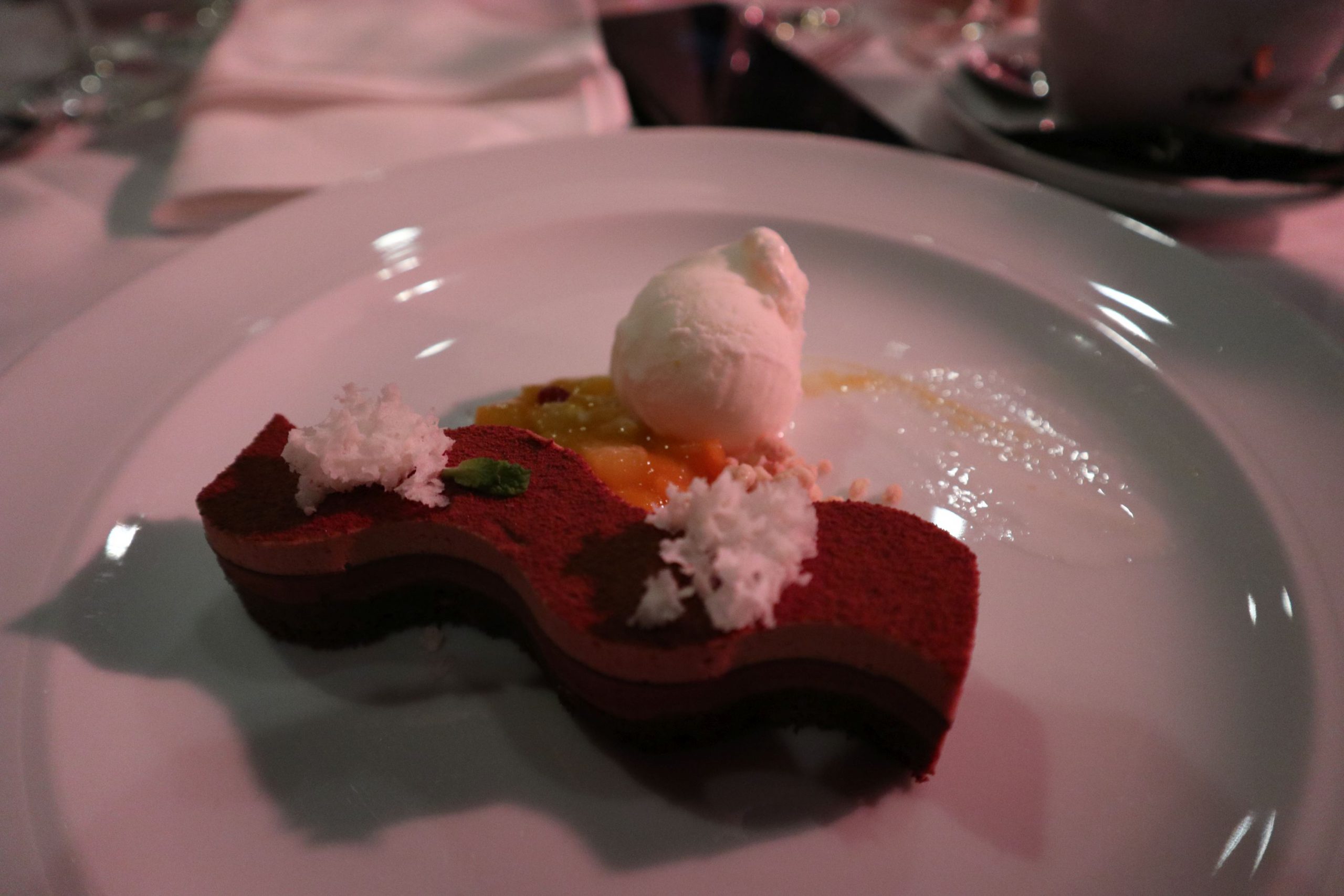 Das Dessert war eine Art Mousse au Chocolat. Sie war weniger „schokoladig“ bzw. intensiv wie man es von einer klassichen Mousse kennt. Das war aber nicht schlimm an dieser Stelle. Dafür war sie sahnig, locker und dem fruchtigen Mango Ragout wurde nicht die Show gestohlen. Das Eis gab es nicht zum probieren (was ein Jammer!).