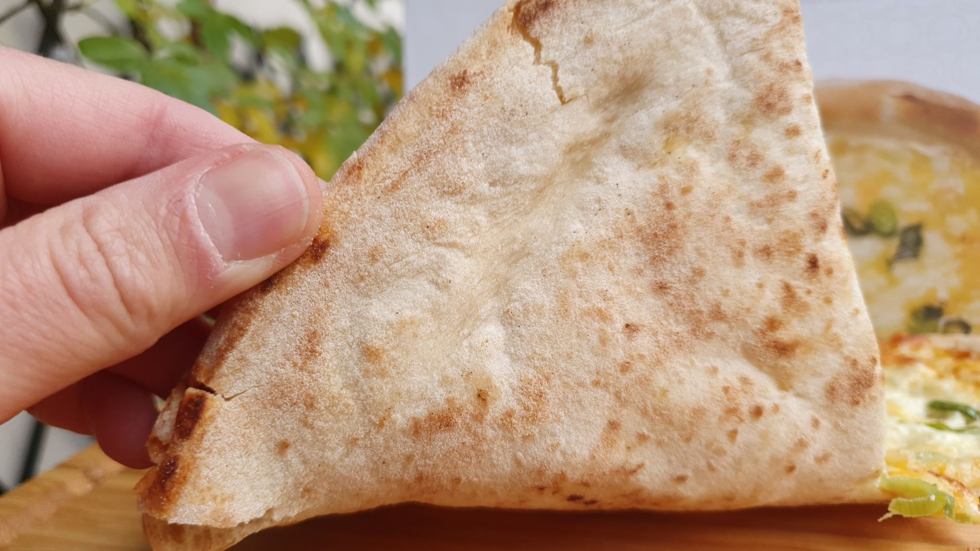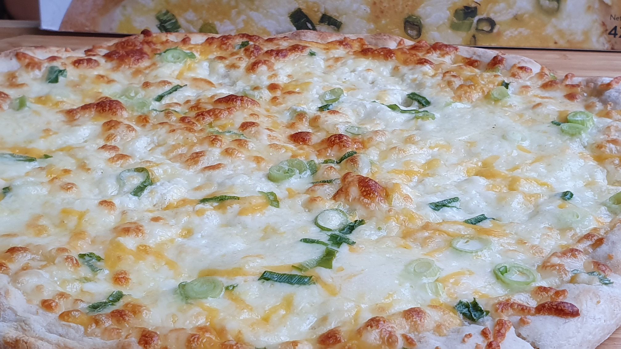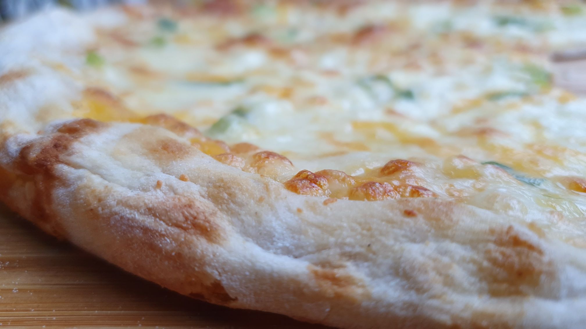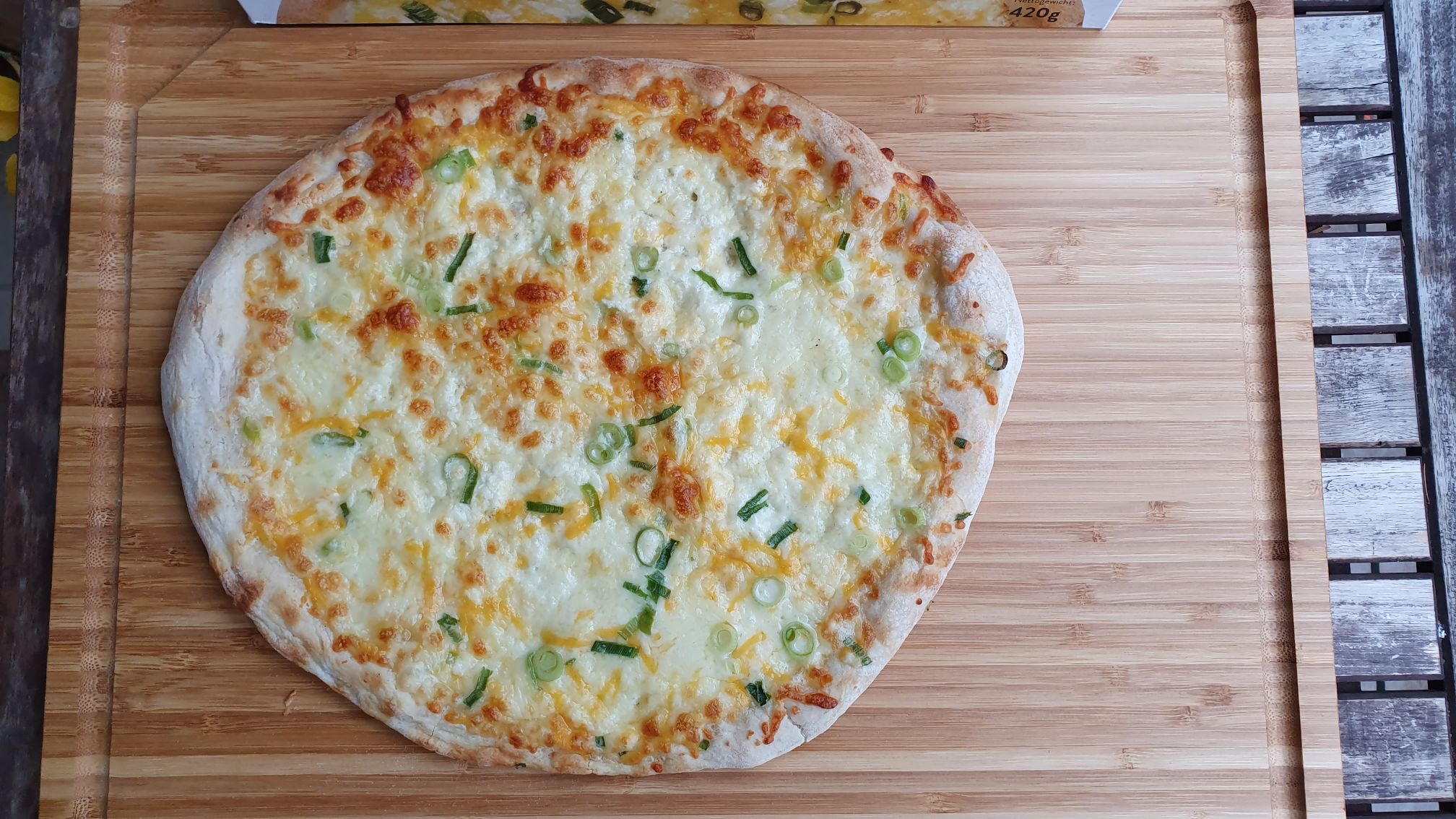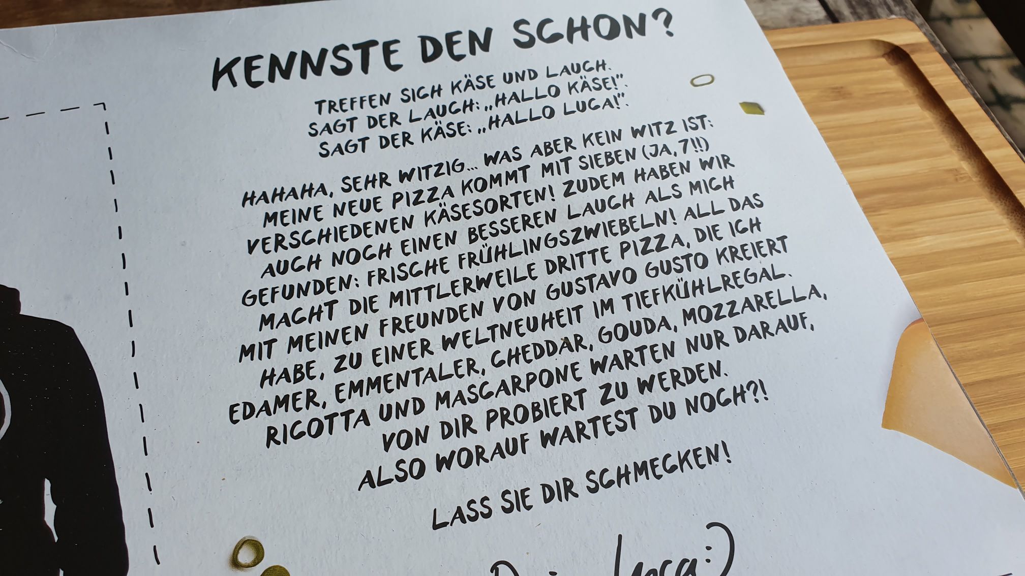 Wie erläutert gibt es sieben Sorten Käse auf der Luca Pizza 3. Es gibt keine Tomatensauce, stattdessen ist die Basis „weiß“. Es gibt Mozzarella, Ricotta, Mascarpone, Edamer, Gouda, Emmentaler und Cheddar. Das ganze dann auch mit etwas Handarbeit geformt und auf Art einer Steinofenpizza.