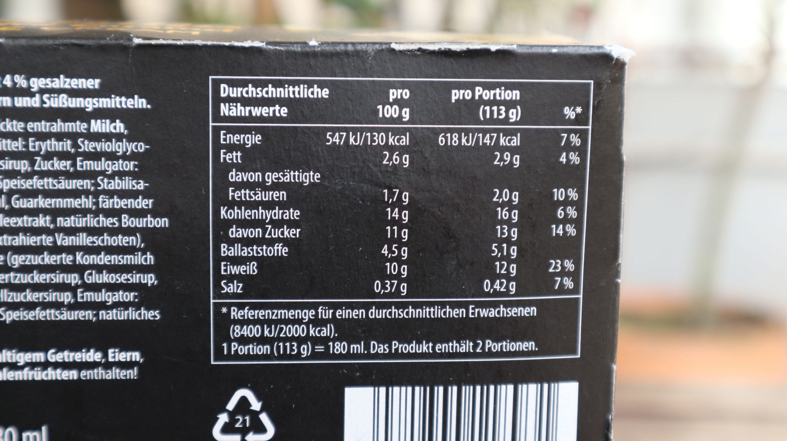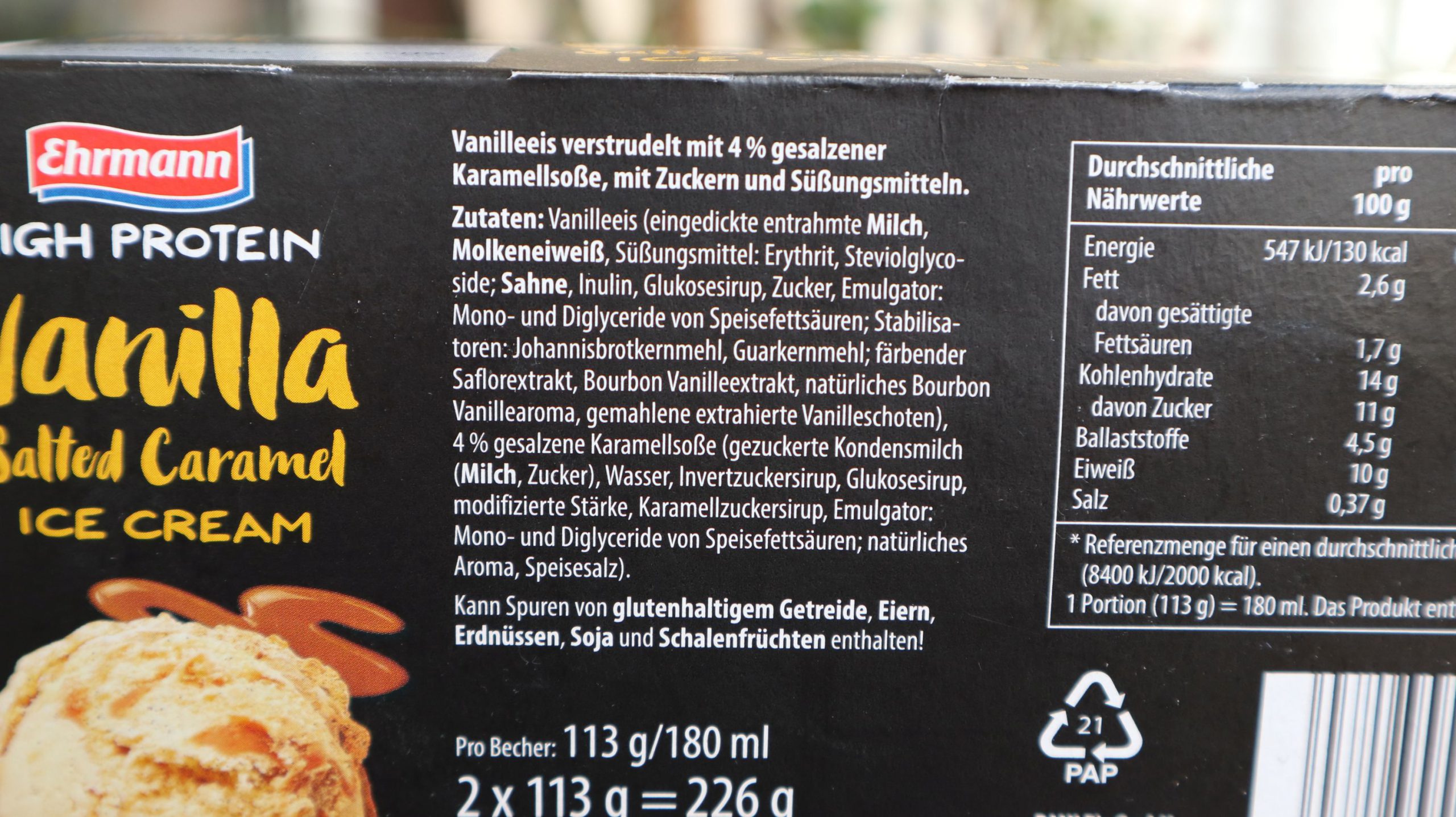 An den Nährwerten kann man erkennen, dass man hier wirklich „fittes“ Eis hat mit der Ehrmann High Protein Ice Cream. knapp 130 kcal sind nicht viel für 100 g Eis und ca. halb so viel wie bei richtiger Sahneeiscreme wie Ben & Jerry’s oder Häagen-Dazs. Der Proteingehalt ist mit 9-10 g pro 100 g auch erstaunlich hoch bei so wenig Kalorien. Diese werden eingespart indem wenig Fett drin ist und der Zucker weitestgehend durch Erythrit und Stevia ersetzt wird. Um ein gutes Mundgefühl zu bekommen sind Bindemittel und Verdickungsmittel wie Carrageen, Johanissbrotkernmehl und Guarkernmehl drin.