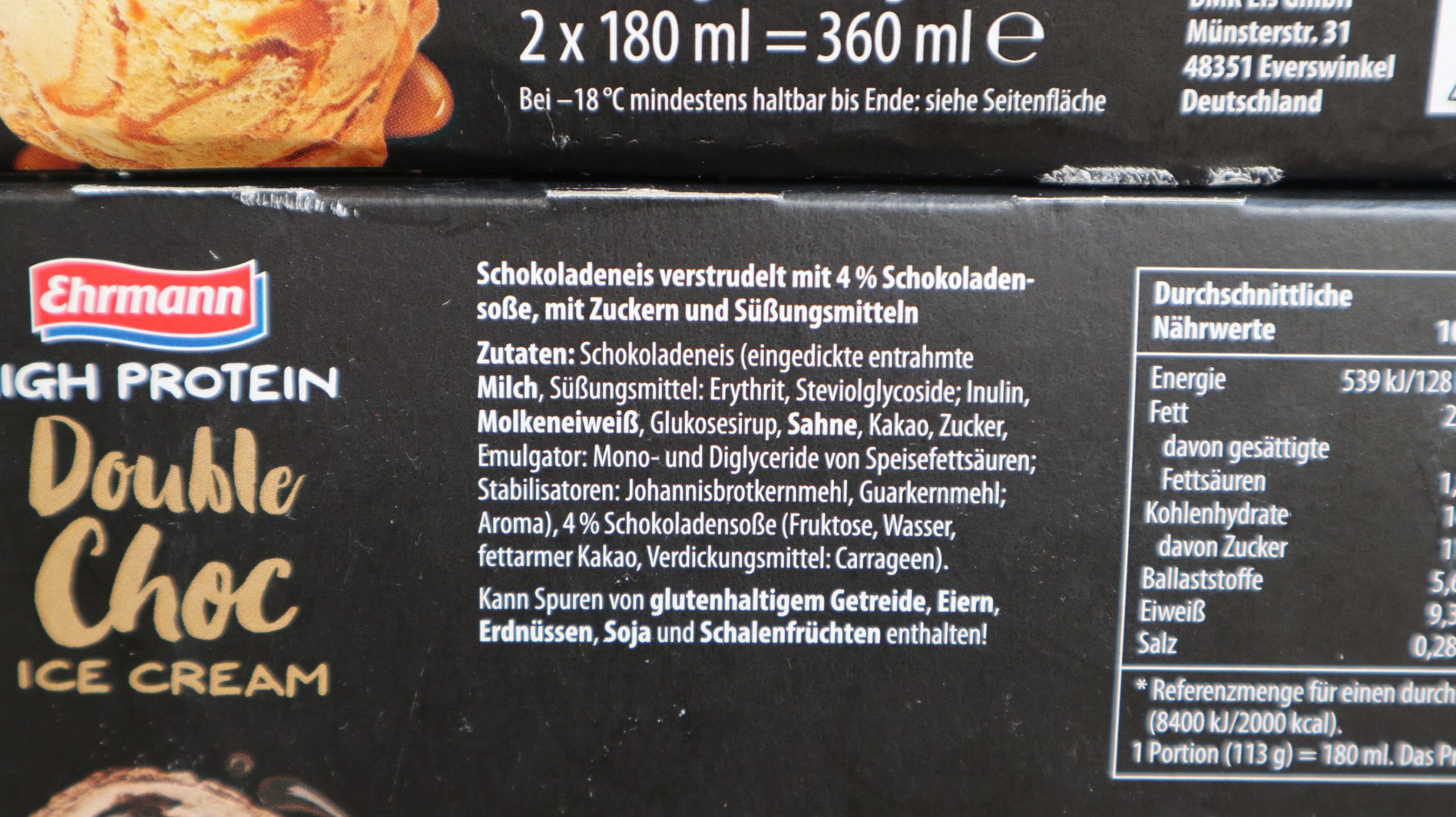 Ich habe mir gestern high Protein Doble Choc ICE cream von Ehrmann gekauft und auch gleich probiert. Ich finde es schmeckt gruselig. Es schmeckt nicht nach Schokolade. Es schmeckt nach Süßstoff und undefinierbaren Füllstoff. Da ich es nicht entsorgen wollte, habe ich es mit Eierlikör zu Ende gelöffelt. Warum muss man ein high protein Produkt mit Zuckeraustauschstoff misshandeln? Ich habe auch den Pudding von Ehrmann probiert, einmal und nicht wieder.