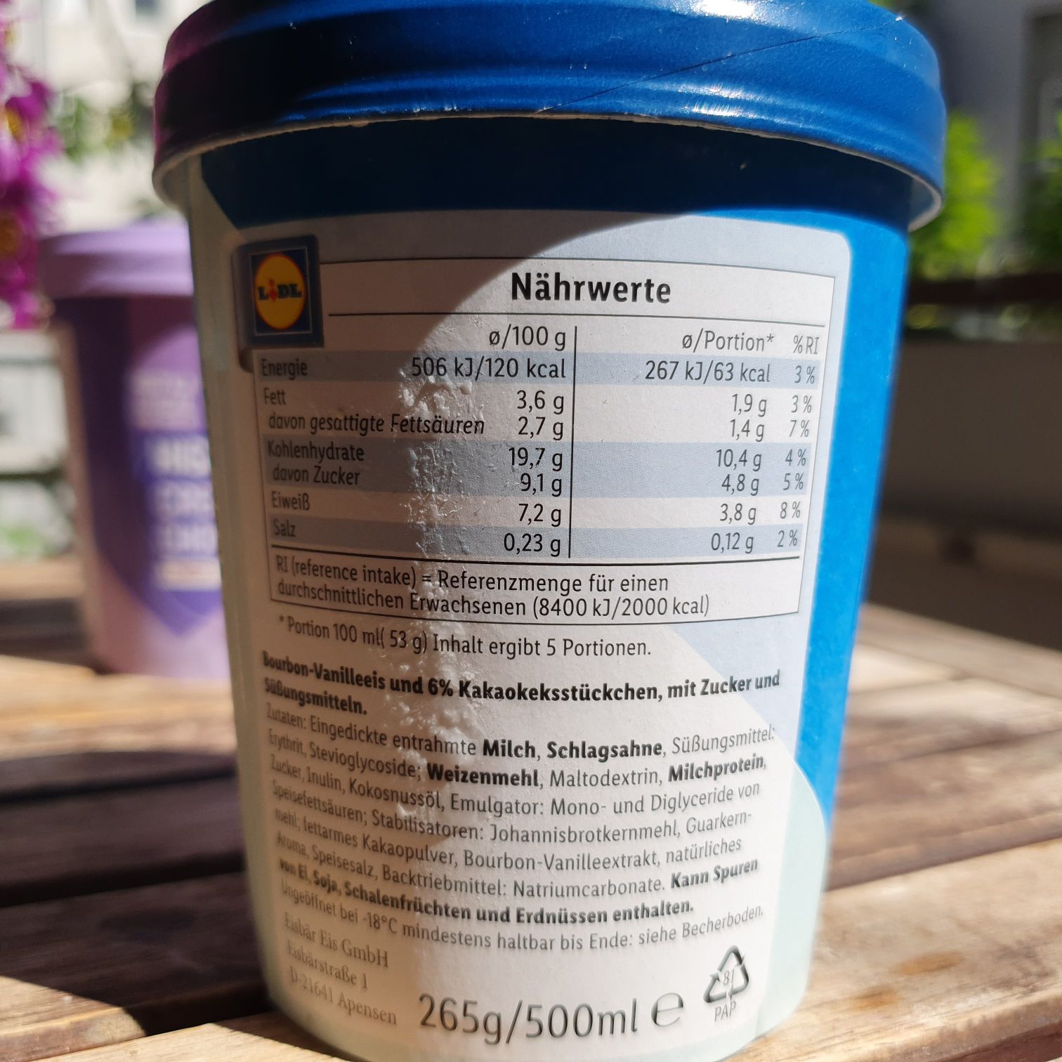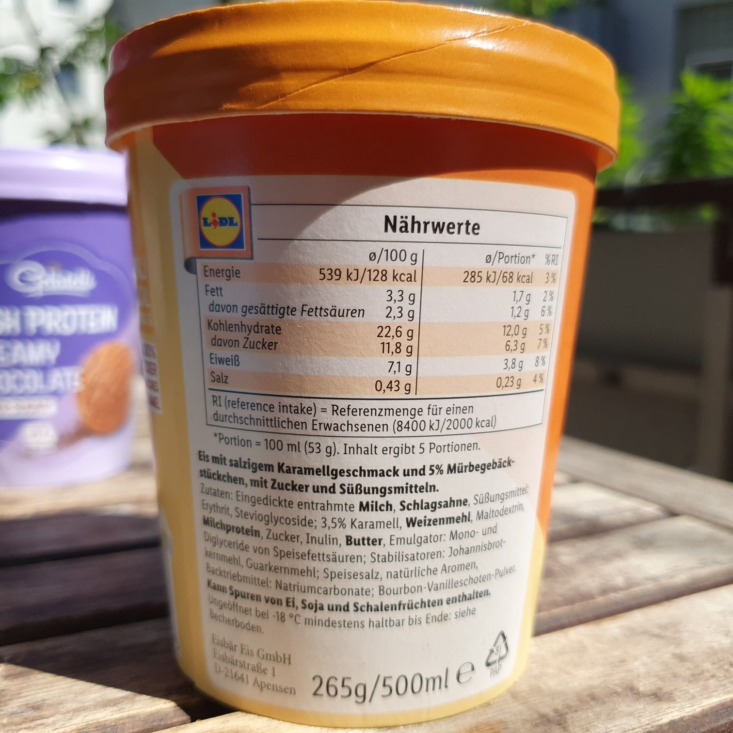 Das LIDL High Protein Eis enthält 500 ml und knapp 260 g. Es kostet 2,99 € und ist damit gerade mal halb so teuer wie die Konkurrenz – ein starkes Argument. Es gibt die Sorten Cookies and Cream, Salted Caramel Cake sowie Chocolate. Die Sorten entsprechen Breyers Delight als Vorbild. Fast schon frech, wie stark da kopiert wird. Der Hersteller ist übrigens Eisbär – die machen total viel Eis für andere Firmen. Zuletzt auch das Moophoria-Fake von Penny.