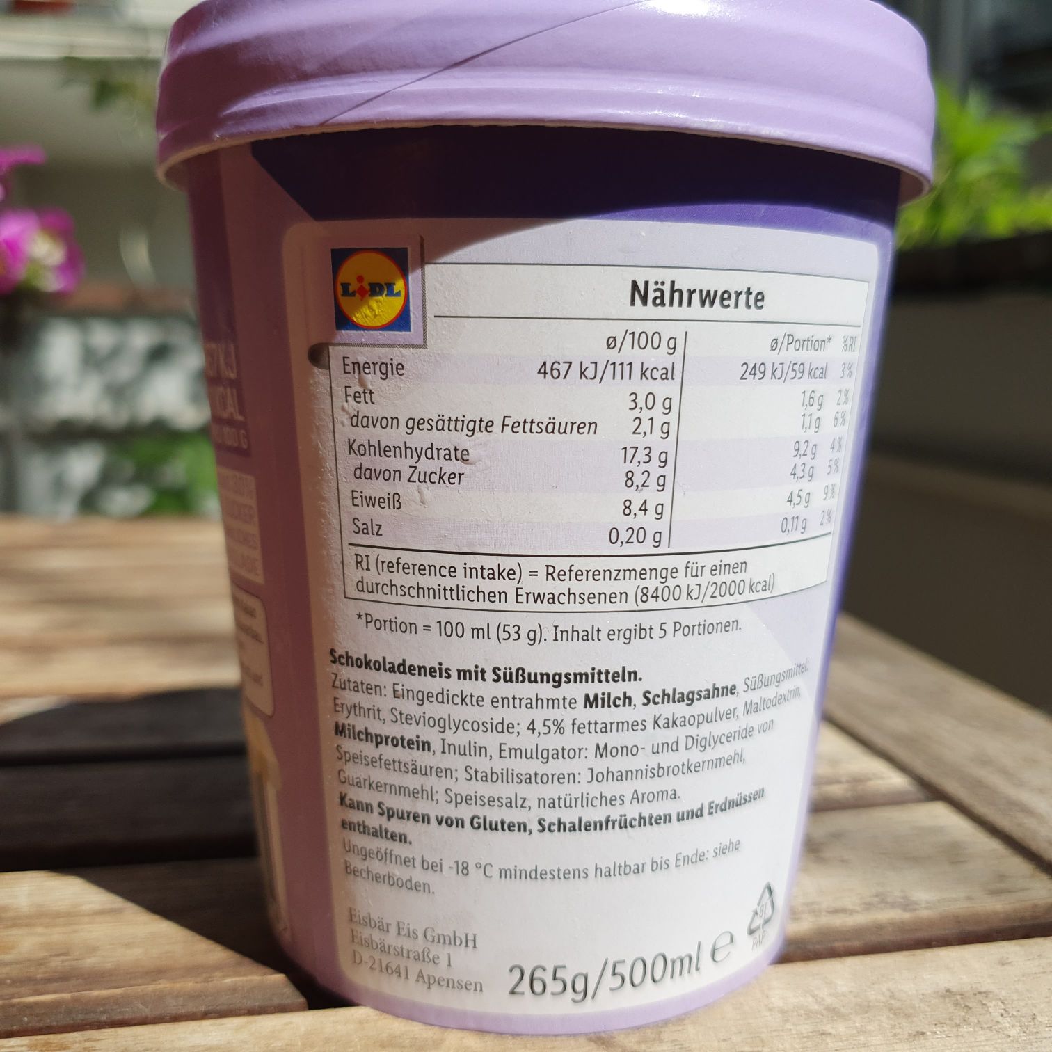 Ausführlicher gehe ich im Video darauf hier sage euch aber gesagt, dass Kalorien hauptsächlich dadurch eingespart werden, dass kaum Fett im Eis ist. Auch der zuckergehalt ist auf jeden Fall deutlich geringer, und der proteingehalt erhöht. Wirklich viel Protein ist es allerdings nicht, aber schon mehr. Um die Konsistenz hinzubekommen wird mit vielen Bindemitteln gearbeitet.