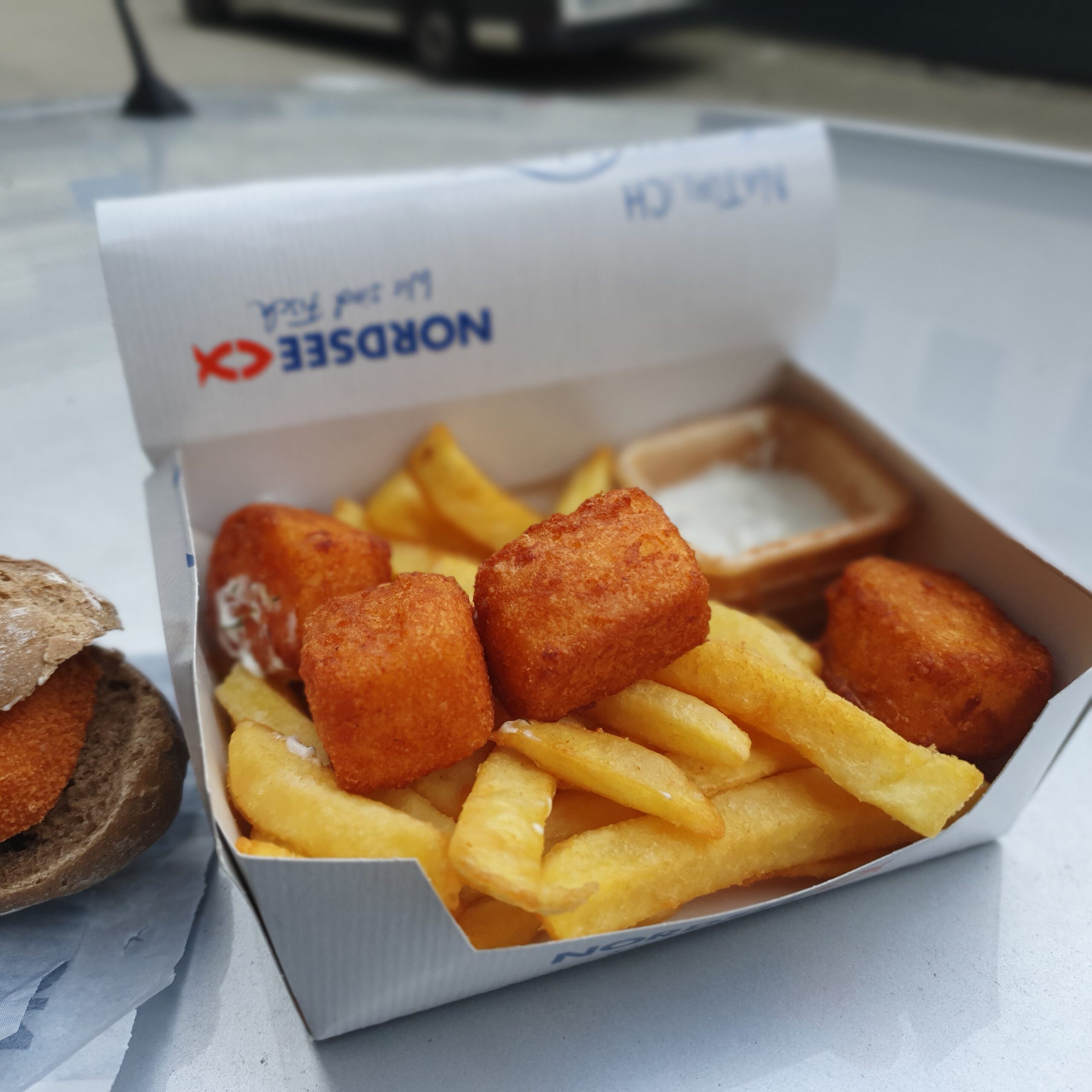 Dieser vegane Fisch ist ebenfalls paniert aber in Form von Nuggets. Dazu gibt’s dann natürlich Pommes („Chips“ genannt  in Großbritannien). Auch hier kann man eine Sauce nach Wahl nehmen. Vorneweg: Was für abartig geile Pommes! Ich glaube ich gehe Öfter zu Nordsee – wegen der Pommes. Lecker! Außen knusprig, innen cremig und perfekt gewürzt.